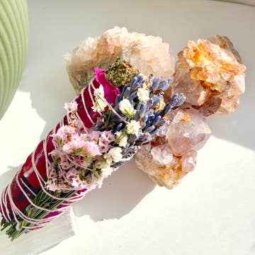Sacred Smoke kit bundle || Palo Santo || The burning of Palo Santo has been used to purify energies in a ceremony to protect from negative energies, bring clarity + healing to our spiritual body, and make way for us to connect with our higher purpose in meditation. || Lavender || a pleasant and soothing scent. This herb will help you relax. It is also known to increase deep sleep once inhaled. || Celtic Knot|| The Trinity knot is also called the Triquetra, meaning “triangle” in Latin. In Celtic mythology, knots symbolize the sacred geometry of the universe and the interconnectedness of all life in the universe. In addition, it is a symbol well known for protection from evil spirits. Citrine: Prosperity, Joy, and Energy || How to Smudge || Prepare a fire-resistant dish, shell, or vessel with sand to hold your smudge stick/sage or extinguish it once you have completed your clearing. Light your smudge at one end until it is full of flame, and then gently wave or blow the flame out.