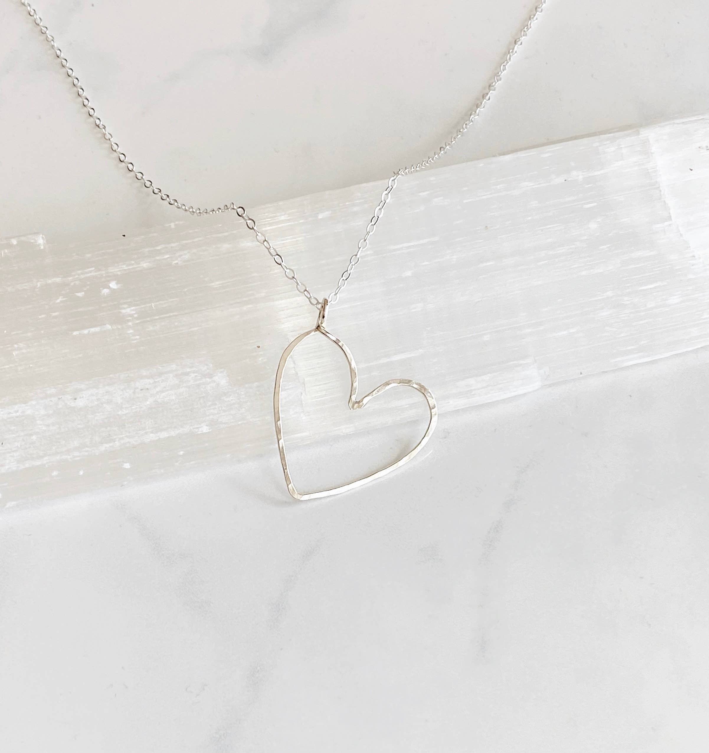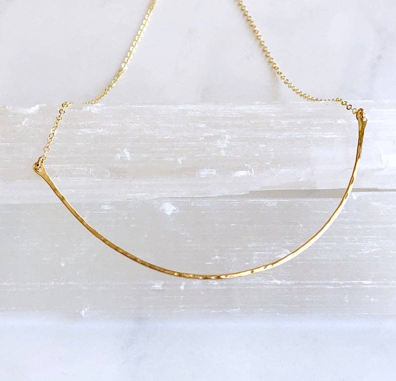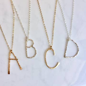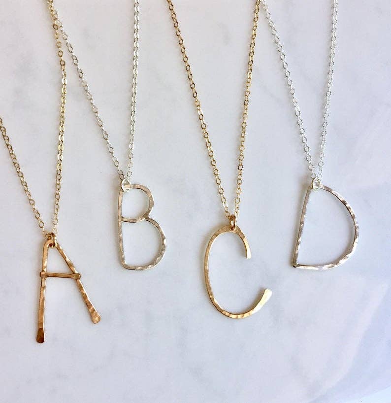 My most popular necklace by far! This necklace would make the perfect gift for yourself or someone else. Each letter is hand forged using either 14kt gold fill or sterling silver wire. The letters are hammered with a dappled texture to catch the light. Each one is unique. The letters measure approximately 1" high and are hung on a fine but sturdy cable chain and finished with a spring ring clasp and my signature large end ring. The chain length including clasp is 17”.