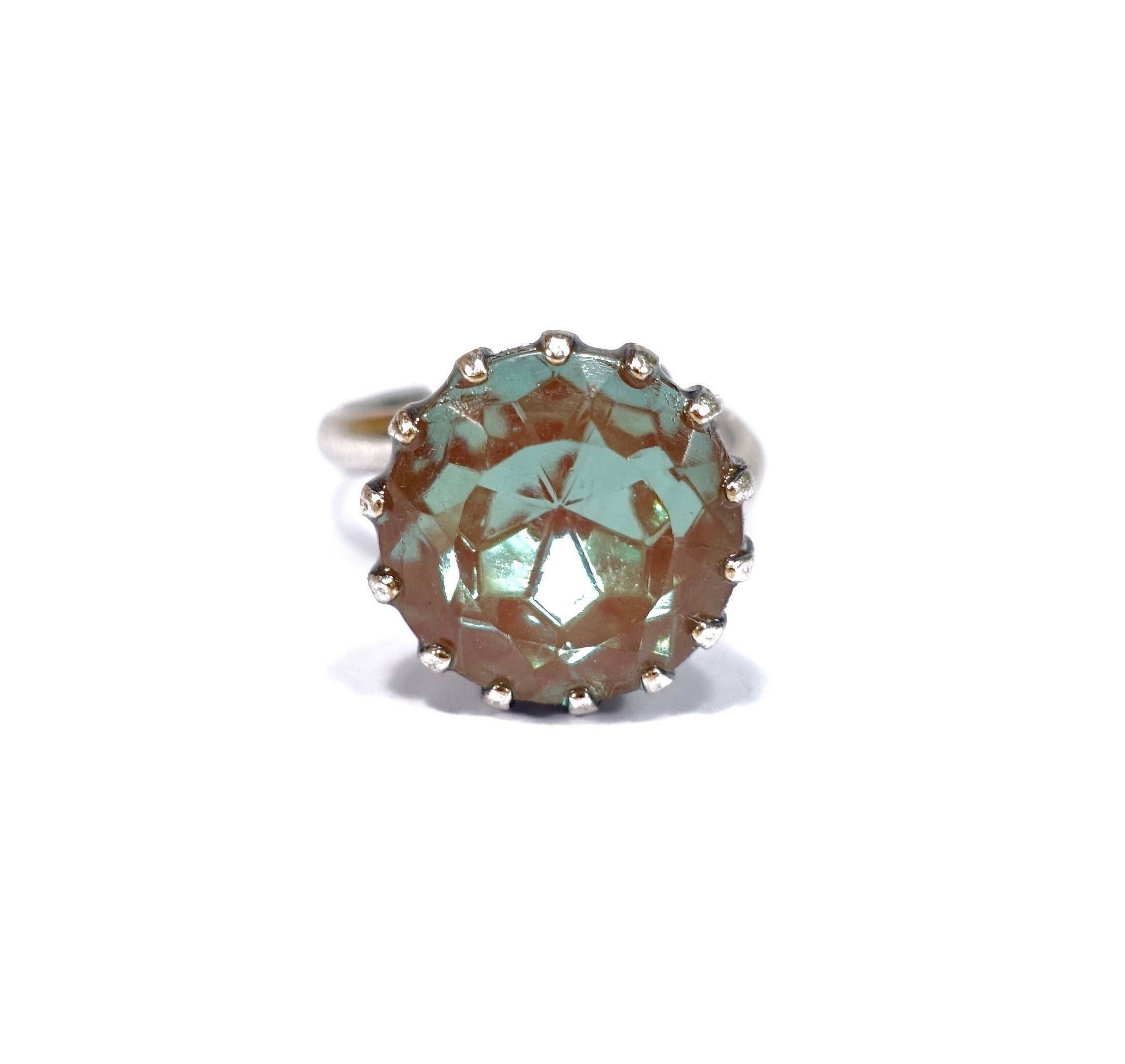 Fire Opal Gold Red Ring adjustable opal oval handmade glass stone 1960s fire opal handmade in Cologne The depicted ring is handmade in our Cologne studio. The gold-colored setting is made of old brass, genuinely gold-plated. The inserted stone is original Bohemian handmade glass from the 1960s. Stone size: Approx. 18 x 13mm The ring band is adjustable. Color: Fire Opal For this finger jewelry, we use exclusively materials from Germany. All work steps are carried out under fair conditions in Germany. The vintage Bohemian glass stones used are from the 1950s to 1970s and are handmade.