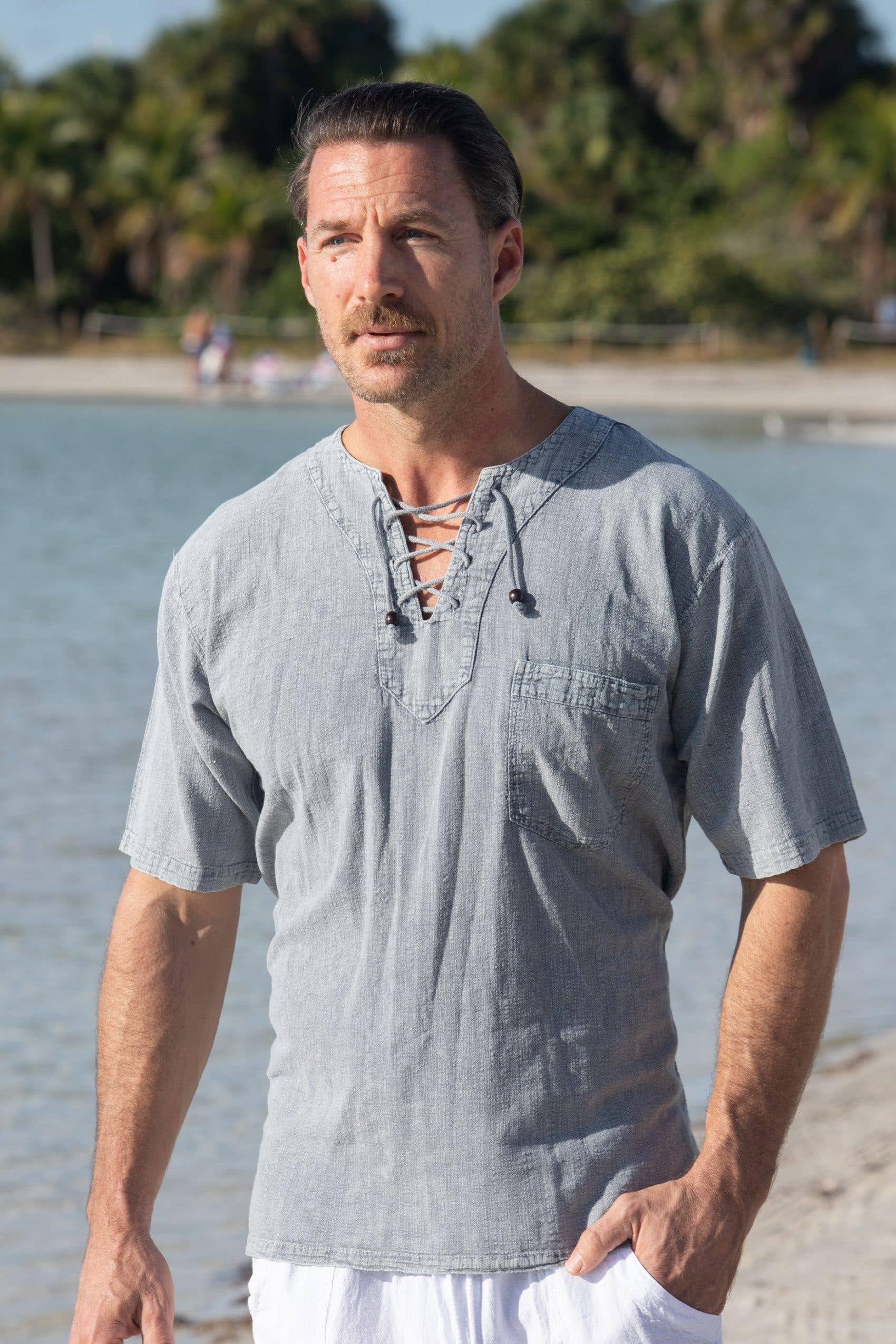Cotton Natural cool and casual Men’s shirt. V neck short sleeves with drawstrings. Made from the finest Peruvian Pima Cotton. Soft and comfortable, breathable relaxed fit. With a pocket and a side hemline slits.