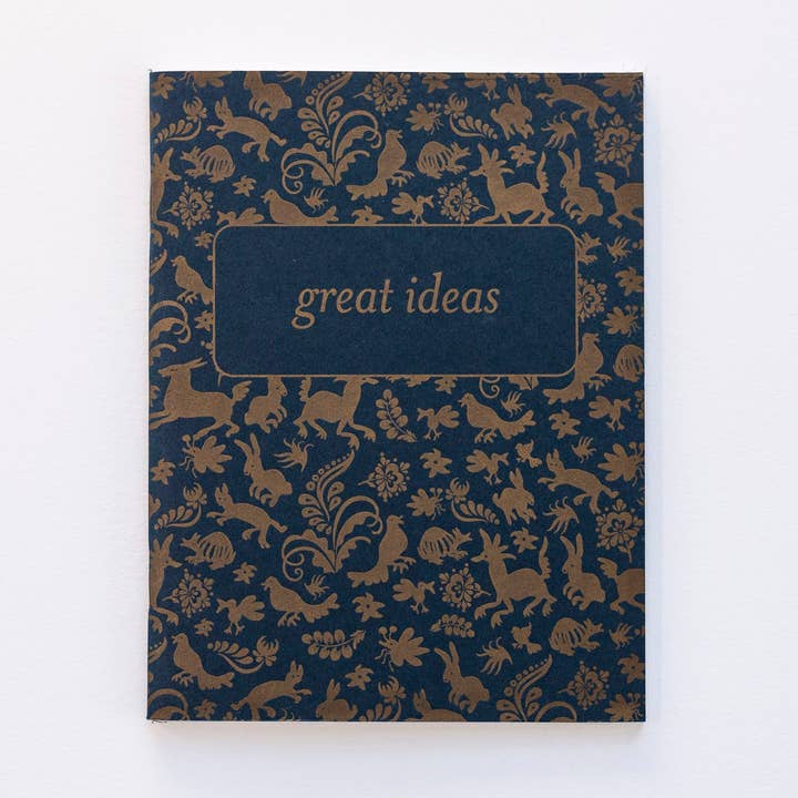 A2 notebook, saddle stitch. The cover is letterpress printed on 140lb French Paper. 40 blank pages. Inside pages are 70lb finch, opaque white. Cello sleeve.