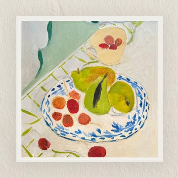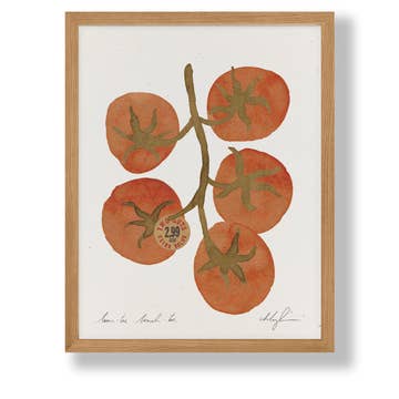 Museum-quality art print made on thick matte paper. Printed by the artist in Portland, Oregon. Comes in a clear plastic sheath with a firm backing board. Each print is stamped on the back with the artist's information. Your customers can frame their prints, pin them straight to the wall, or hang them in a wooden poster hanger! keywords: heirloom tomatoes watercolor painting illustration art red vegetable summer kitchen food chef