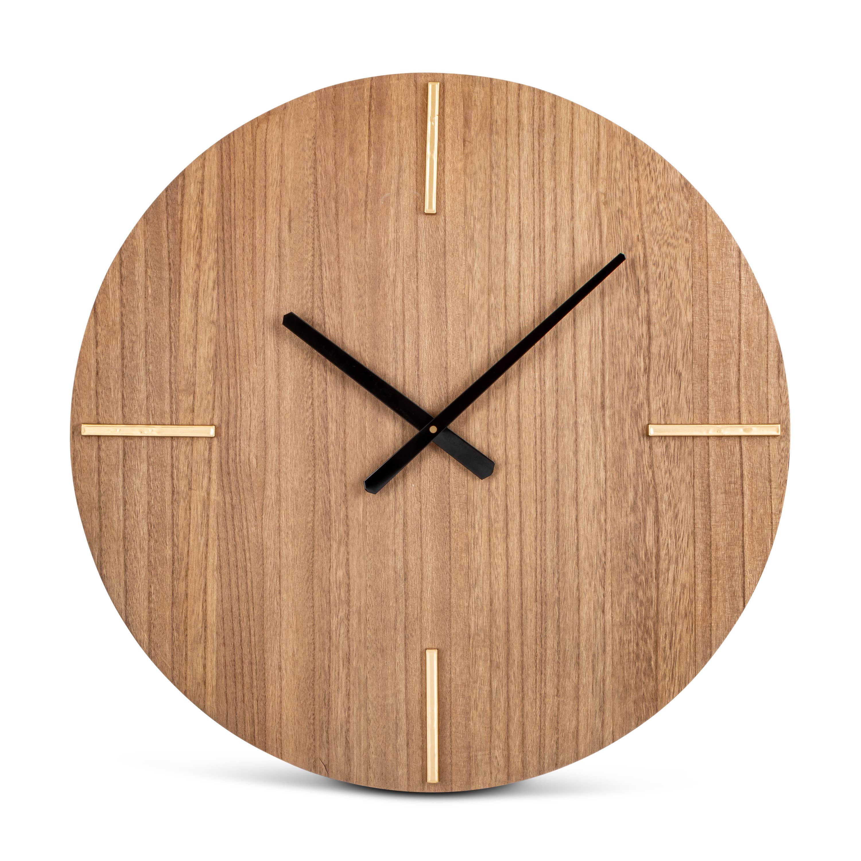 Maddox is a 13" wooden wall clock in brown ash veneer. You'll love the golden 3D numerals and open airy feel to this clock as no cover is necessary on this ultra chic piece. This clock features clean-lined essentials that are as good looking as they are functional. This stylish clock's urban design is a hip touch on any wall. Features: Brown Ash veneer wooden open dial wall clock, features silver colour index and hands. Silver-tone ultra-modern 3D numerals. Clock allows you to feel the warmth of the wood and feel the flow of time. Powered by 1 AA battery (included). Overall dimensions: 4.3 X 4.3 X 2.12.