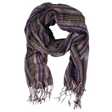 This is a luxurious scarf by both qualities of fibers - a mix of silk and wool - and of size. It is generous in its proportions with a width of 26 inches and a length of 80. It has a beautiful random ikat middle which mixes the navy blue and plum All four sides have adorable hand-made tassels.