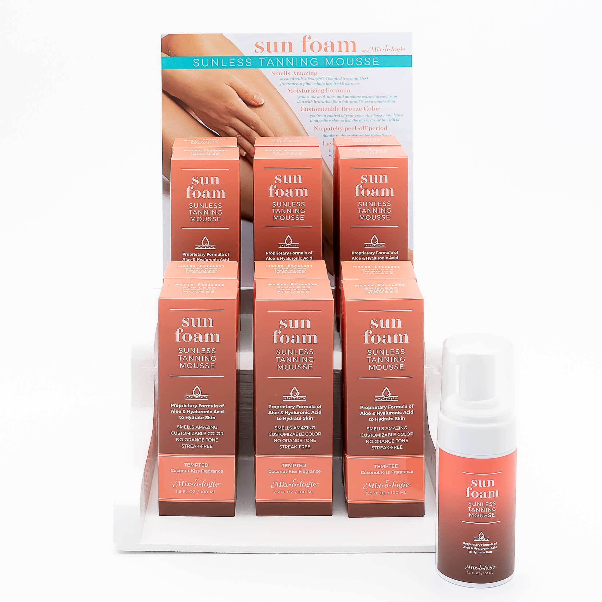 A streak-free sunless tanning mousse that delivers a bronzed, sun-kissed glow in minutes. Formulated with a proprietary blend of Hyaluronic Acid, Aloe, and Purslane Extract, SunFoam hydrates and nourishes your skin – giving you a summer glow that lasts a full week, without the patchy peel off period. Forget the typical self-tanner smell – this hydrating mousse smells like a tropical escape, with a pina colada-inspired fragrance that’ll leave you feeling like you’ve just stepped off a beach in paradise. Why You’ll Love It: Won't dry your skin out – Doubles as a spa-like skincare treatment Natural-Looking Color – No fake, orange tones – just a beachy, bronzed glow Smells AMAZING – Like your favorite summer cocktail Customizable – Build your perfect shade, from sun-kissed to deep bronze EASY! Streak-Free & Fast Drying