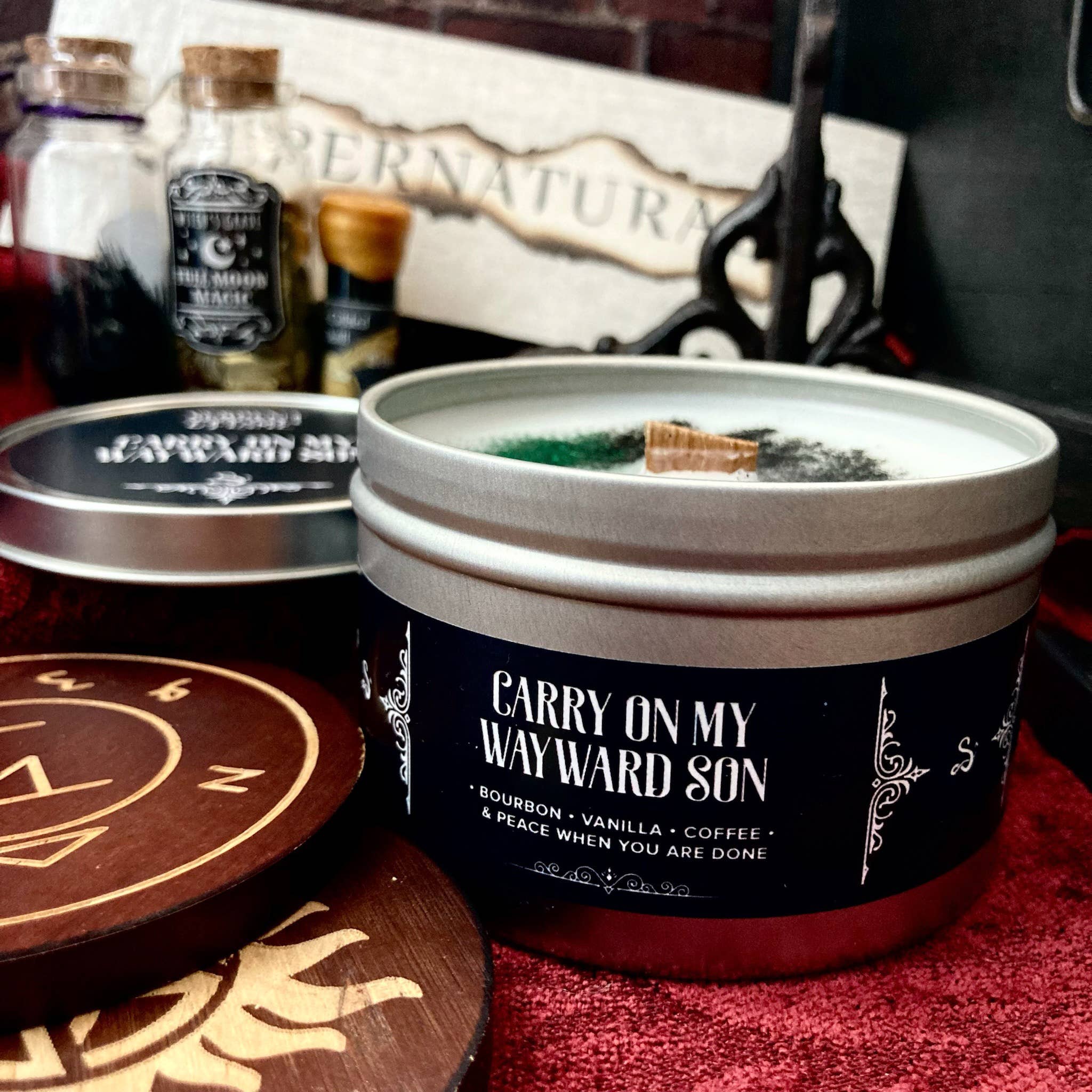 ‣Blend: white birch, gunsmoke and toasted, sweet marshmallow ‣Scent Notes: smoke, woods, sweet ‣Great for supernatural and tv series lovers ‣Hand poured, paraffin-soy wax with paraben and phthalate free fragrances. ‣Wood wicked candle for a clean burn and soothing crackle. ‣Small batch made so you may see some slight variances in color, glitter and scent.