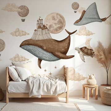 Cute airplane decals that children love! They look great above a crib or bed! • Application tool and EASY Step-by-step detailed instructions included. • Decals are long lasting, easy to remove, and leave the paint mark free. However, they are not reuseable. • Size: Largest Airplane Size: (approx): 10.5" wide, Largest Cloud Size: (approx): 11.5" wide, • What's Included: Set of 3 Airplanes, Set of 5 Clouds.
