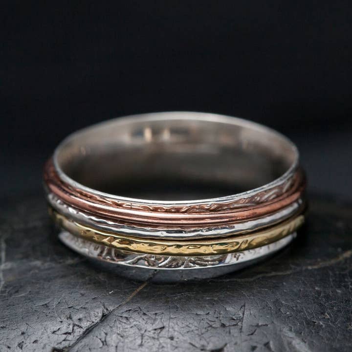 Tri-metal sterling silver spinner ring. Sterling Silver Spinning Meditation Rings. Handmade sterling silver rings with spinning bands featuring natural stones, copper and brass. These rings are handmade by fair trade artisans in Rajasthan, India and inspired by the ancient prayer wheels of Tibet.