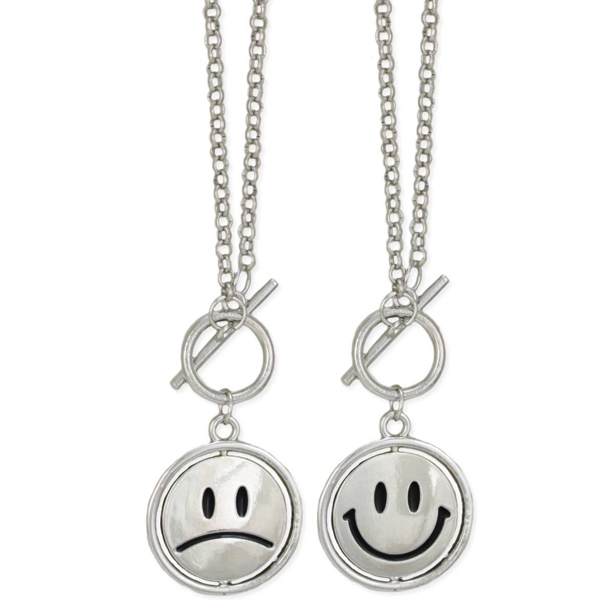 Delicate silver chain necklace with 3 lines including circle & bar charms. 16-18" long, 3/8" circle charm, 1" bar charm.