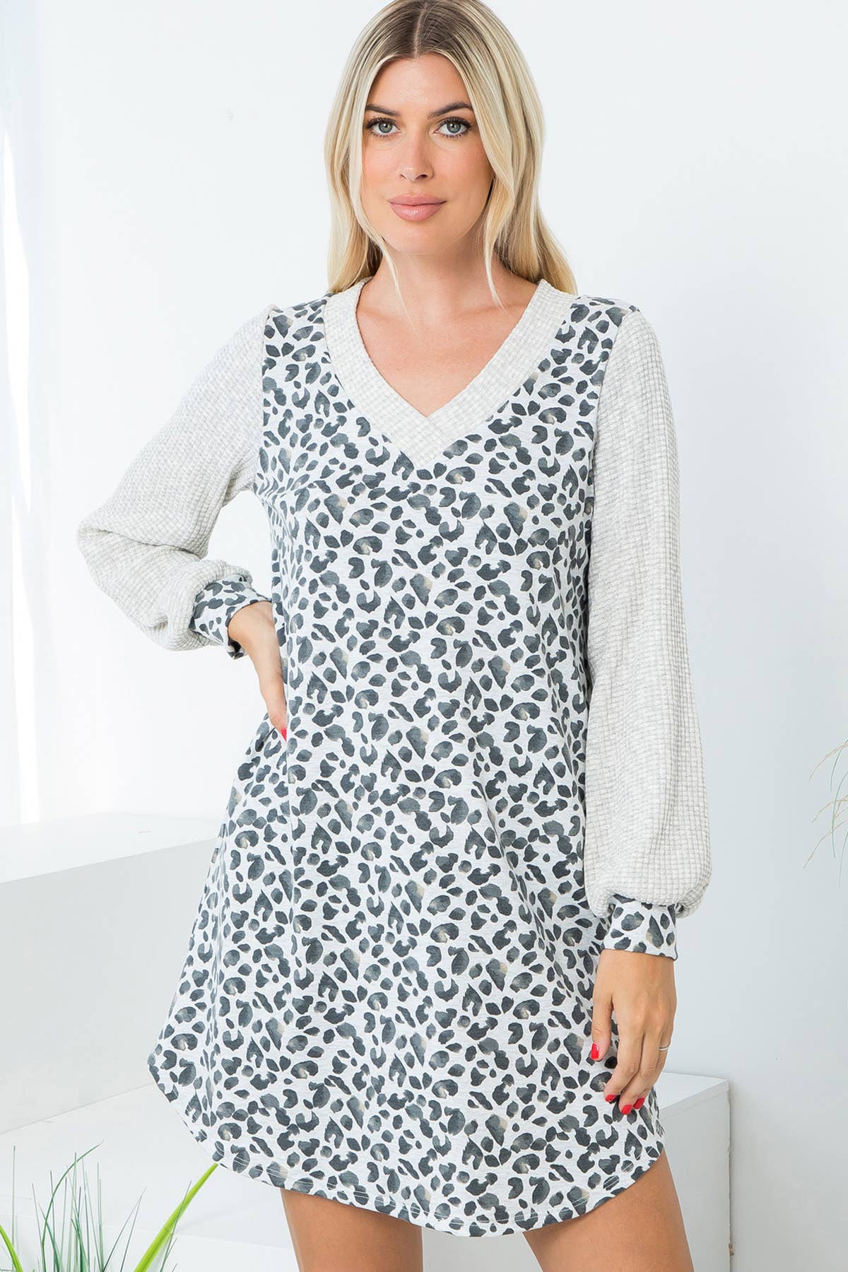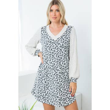 ** ONLY SOLID COLOR CHANGES ** 95% RAYON 5% SPANDEX LONG SLEEVE ROUND NECK SOLID AND ANIMAL LEOPARD PRINT CONTRAST DRESS WITH RUFFLED DETAIL MODEL SIZE: HEIGHT 5'7", BUST 32", WAIST 24", HIPS 34.5" WEARING SIZE: SMALL *The garment color may differ slightly upon arrival due to being taken with professional lighting also depending on what device you maybe using to shop*
