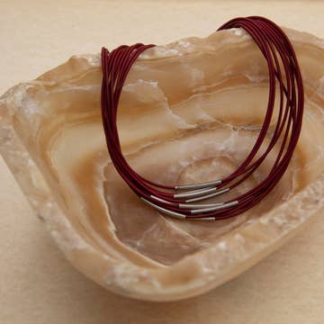 The Petit Water Bowline Necklace is based on the #1 top-selling namesake piece. Connect your favorite colors in this asymmetrical water bowline knotted necklace. Shown in Red Mahogany Cotton. The original Water Bowline Necklace is shown for scale only. * 30" cording wrapped in yarn of your choice * Brass end caps * Gold-plated lobster clasp + jump rings Options: * Yarn color (please refer to the last photo for color names) Shop all Water Bowline options: https://www.faire.com/product-based-collection/pbc_z857xgb7d2 Handmade in Northeast Ohio by Sara McClelland. Made to order and ships in the timeframe currently noted.