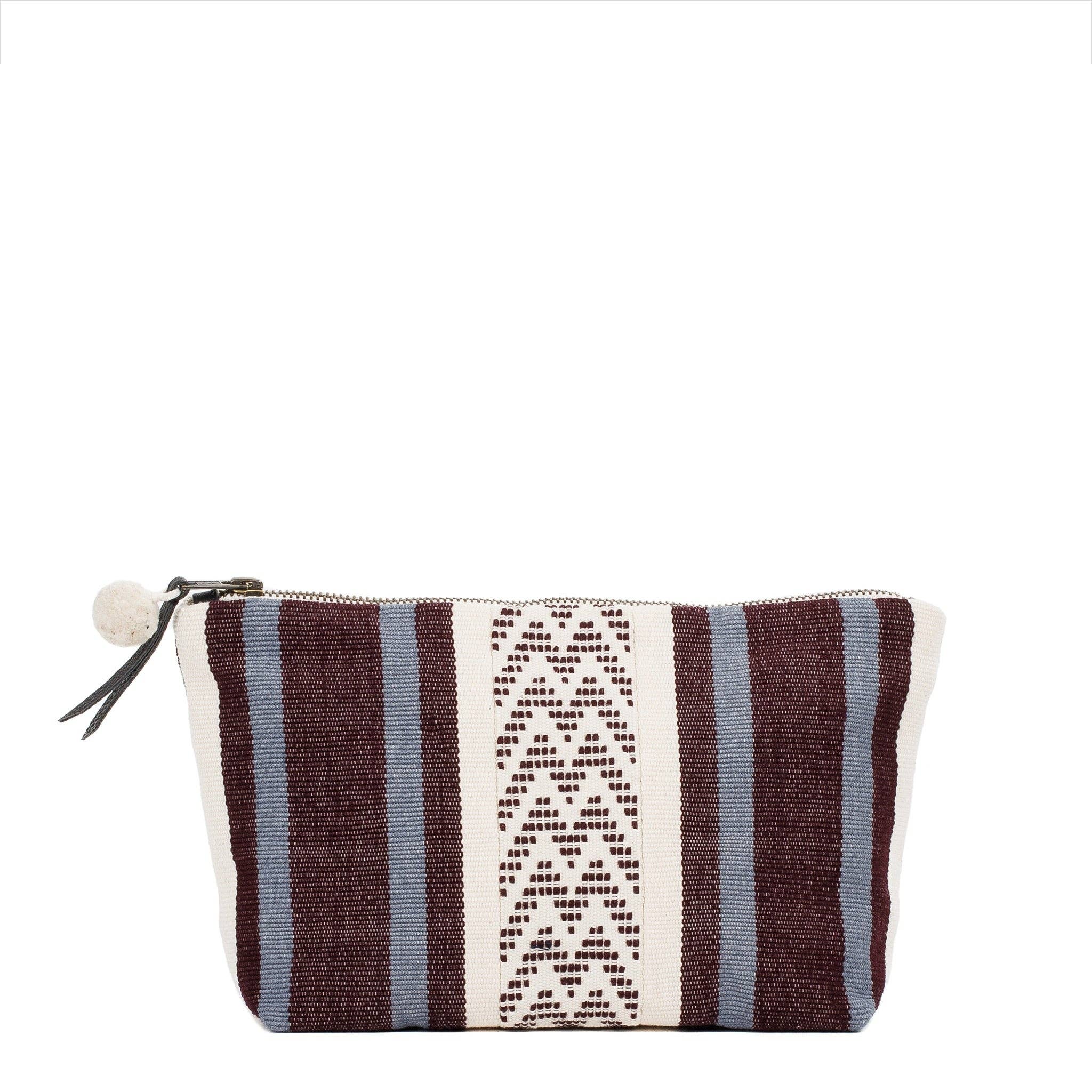 The Soledad Weekender is a lightweight, spacious and comfortable carry- all. Features top zipper, exterior welted zip-pocket, three interior pockets, leather detailing and signature double pompoms. Hand-dye Black 14” H x 21” Top W x 17” Bttm W x 8” D