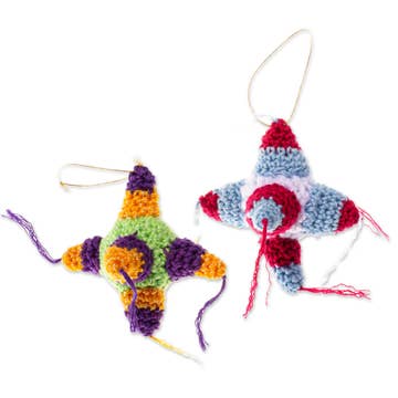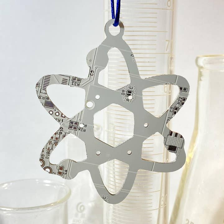 With the aid of a computer controlled routing machine and some programming, green, blue, white, and brown circuit boards were cut into a flask, an atom, a rocket, and a microscope. The untreated ornaments are 2 inches (5 cm) tall and hang from satin cords. As the circuit boards used to create these ornaments are recycled, some minor imperfections are to be expected. The set of 4 ornaments is packaged in a clear-top gift box and are sold by the case of 5.