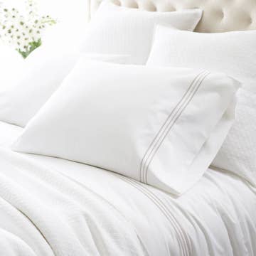 Our 300 thread count percale flat sheets are made from exclusively GOTS and Fairtrade certified organic cotton. Tight yet breathable, this weave gives a light, freshly laundered feel that persists between washes. 10cm header.