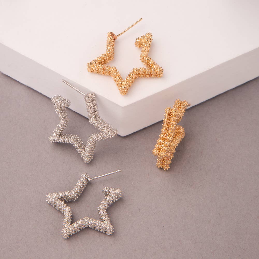 These half star earrings made of handwoven Japanese Miyuki glass beads are truly special. Each statement earring is made from 3 separate diamonds formed from 14 distinct shades of beads and carefully sewn together to create a beautiful half star shape. Although large they are very lightweight and are comfortable to wear. A stainless steel post is sewn on the back with nylon thread. These earrings are handmade by women artisans from vulnerable communities in Medellin, Colombia who receive fair working conditions and compensation for their skills. Materials Miyuki Glass Beads Stainless Steel Post Size Length 2.8 Inches Width 1.5 Inches *This style is available in several color ways. **The last photo is added to show our merchandising earring cards.