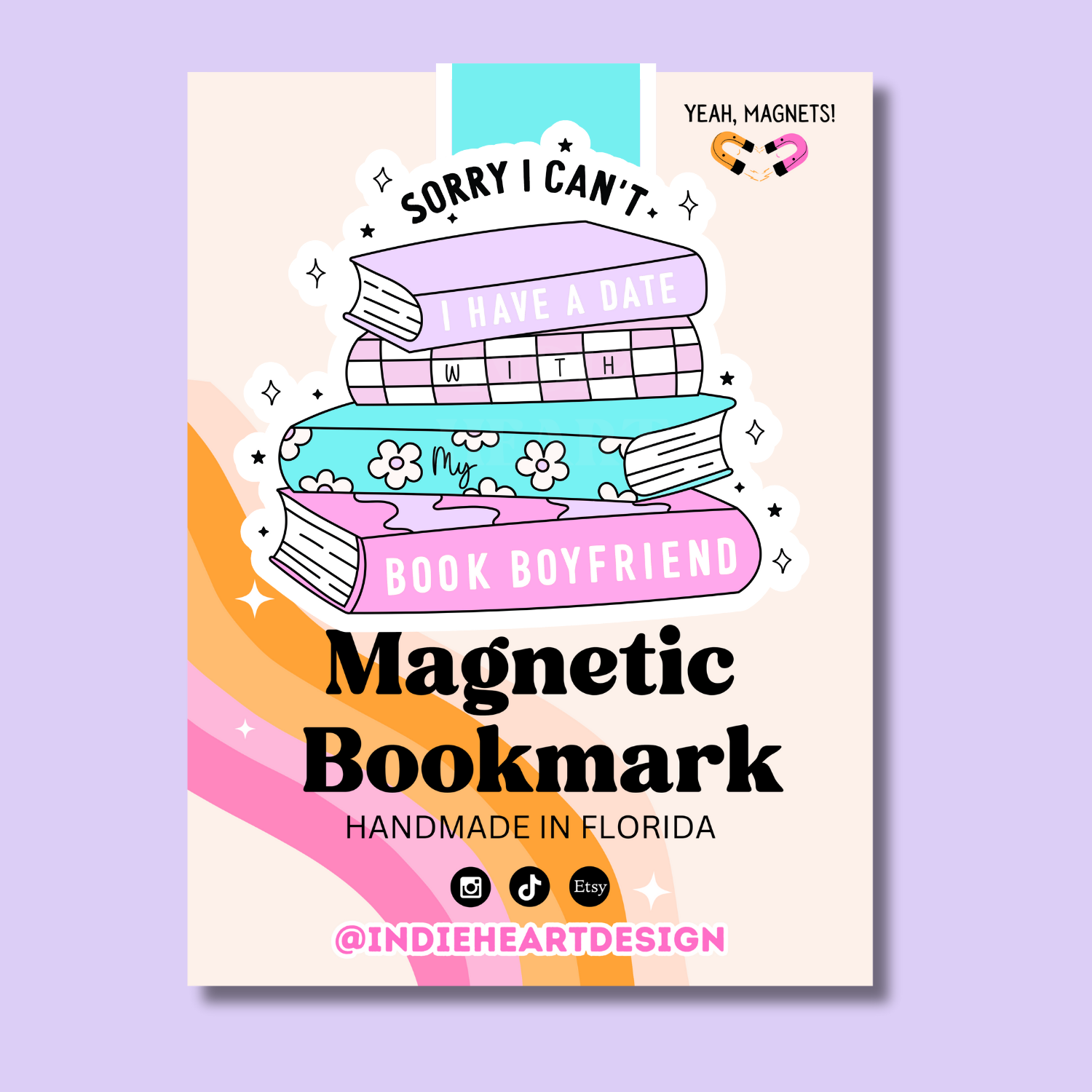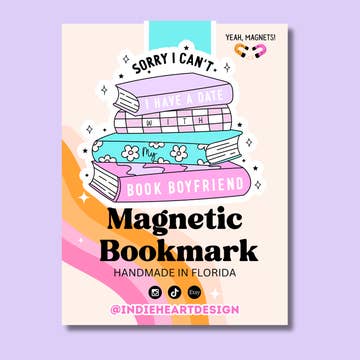 My type is tall, dark, and fictional. Why are men so much better in books? Use this magnetic bookmark while you're reading about your current book boyfriend. *Bookmark Details* - 2.4x2.2 inch bookmark - Full interior of the bookmark is magnetic - Heavyweight glossy cardstock with magnetic backing. *Packaging* - Packaged on a cardstock backer card with a hang tag hole, in a cello bag. - Pricing and UPC barcode printed on the back of packaging card.