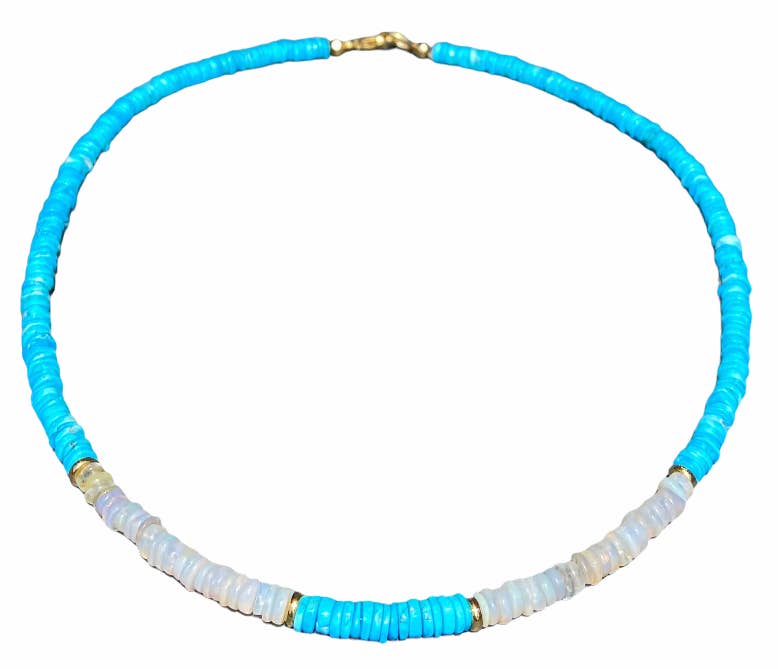 Tiny faceted turquoise beaded choker with 5 gold-fill pave cz diamond shape drops. 13″ long with 2 inch chain extension.