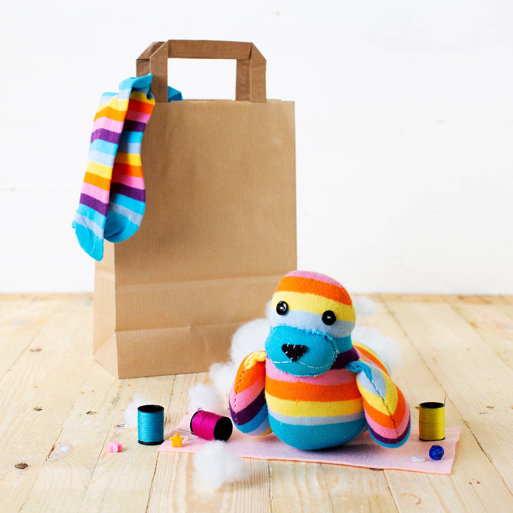 A complete craft kit containing everything you need to create your own Sock Creature! Kit includes: instructions, template, socks, stuffing, needle & thread and items to decorate your creature. Suitable for age 8+. Sock colour may vary from photographs. Fun, bright striped socks in various colour ways will be included. Kit size: Height 28cm, Width 20cm, Depth 10cm.WARNINGS – Suitable for age 8+, however children under 14 should be supervised by an adult. Contains small parts and sharp needle. Keep out of reach of children under 3 years old. Finished creature must not be given to children to pay with. Keep away from fire.