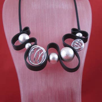 Experience the elegance of our NKL 467 - D9 The Web necklace. This beaded/pearl necklace, in a black and white color scheme, is a creation of Ofelia Cisneros, founder of Designs by OC. Materials sourced globally, including natural semi-precious gem stones, fresh water pearls, tagua beads, paper beads, aluminum wire components, and silicone, reflect our commitment to quality and sustainability. Handcrafted in our California home studio, this necklace is a wearable piece of art.