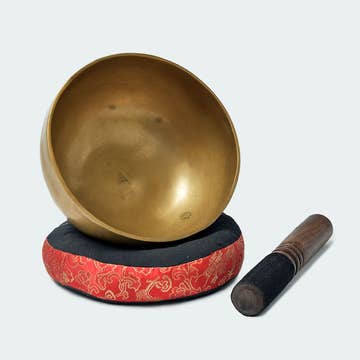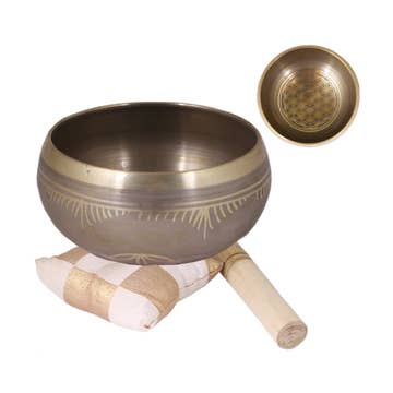 Hand-hammered brass singing bowl with a beautiful hammered design. Singing bowls have been used for centuries in religious and spiritual practices for meditation, relaxation, spiritual well-being and to promote healing. It is believed that the sound and vibration that you create with a singing bowl spread peace on earth. Wood mallet included. Ornate silk cushion not included.