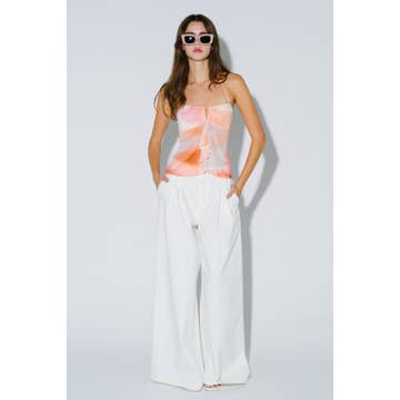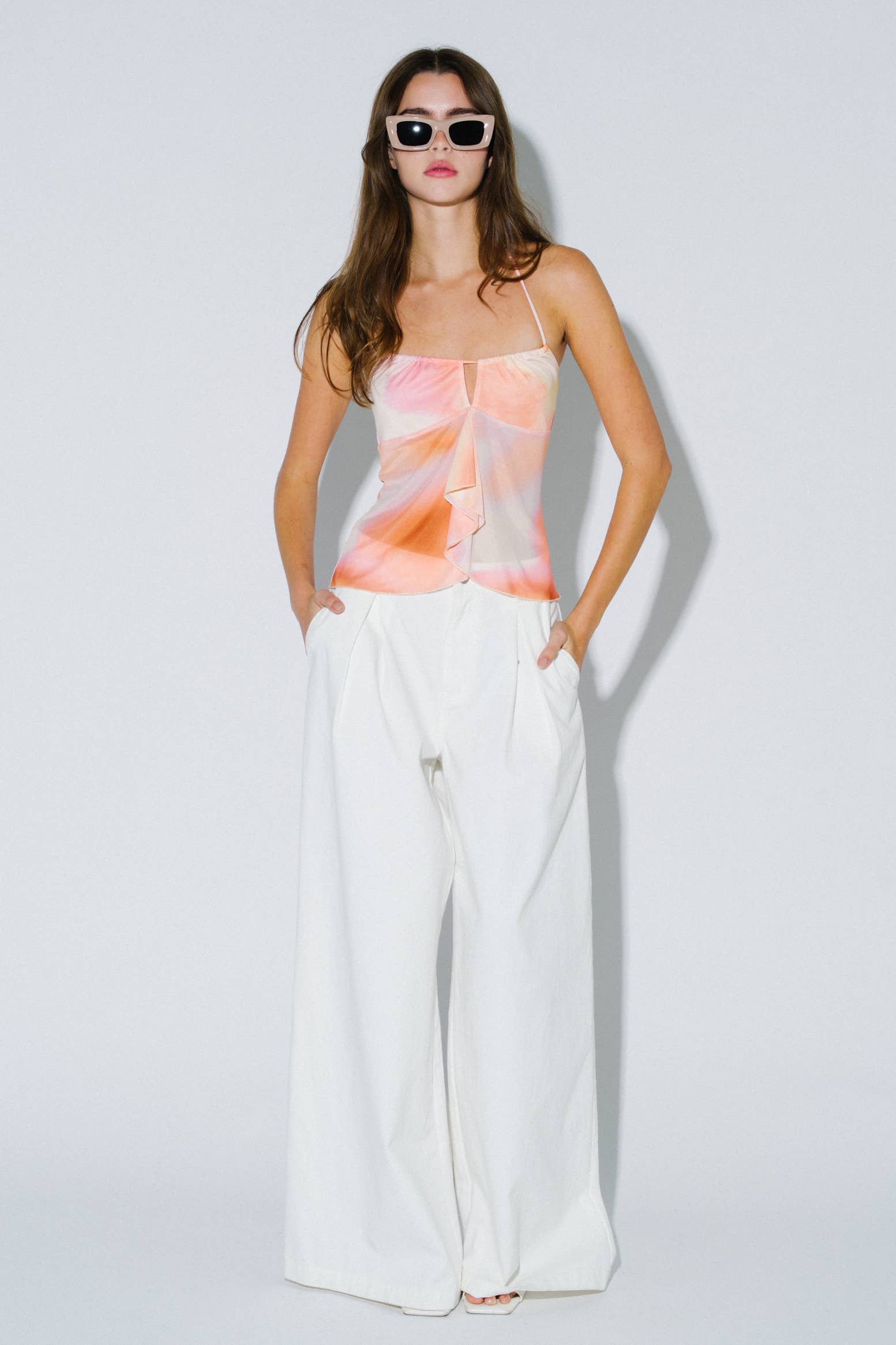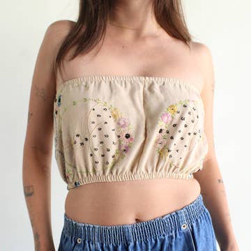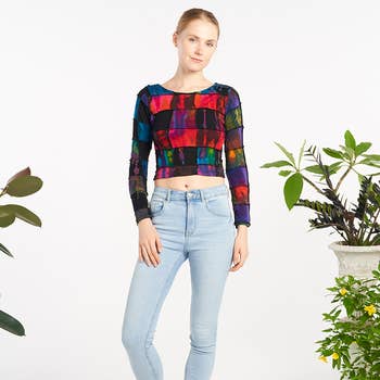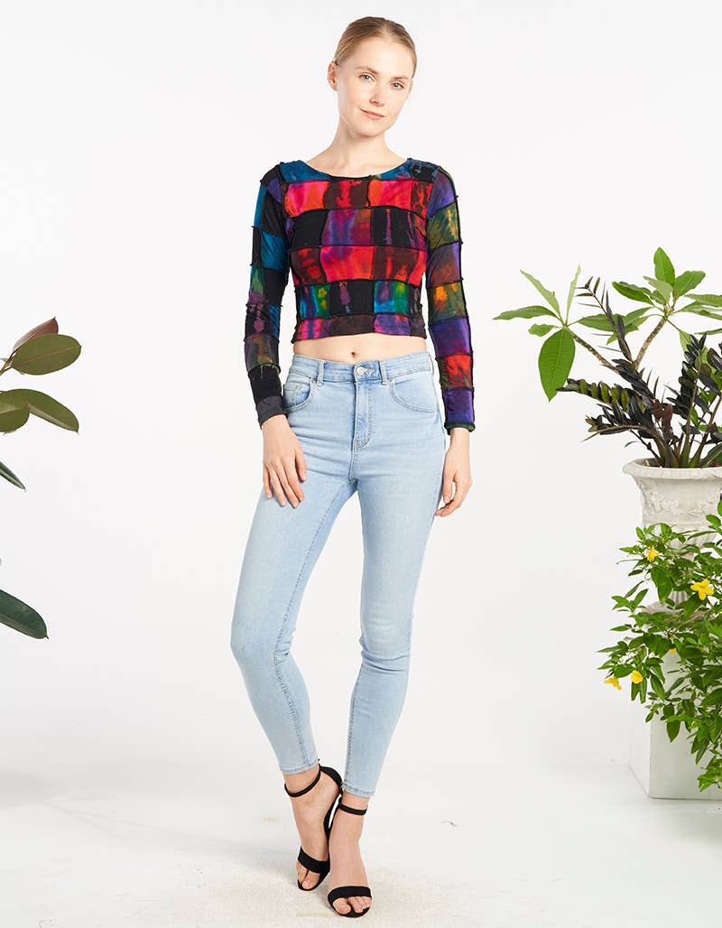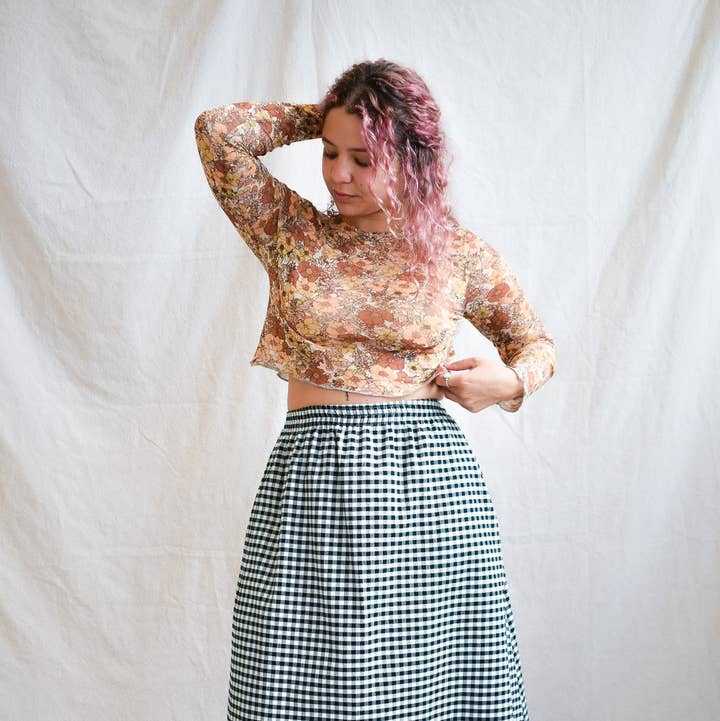 True story: we save every piece of workable scrap fabric that we can. Even if our scrap pieces sit in bins for years and years-- I WILL eventually get to designing something with them. In an effort to bring our production space to a zero-waste model, we prioritize maximum yields with our cutting techniques, and stow away anything workable. These OOAK (one-of-a-kind) crops are a perfect use for panels and small pieces of cherished prints and patterns. They are also extremely cute and easy to style! A boxy Dolman-style top with a scoop neck and a subtle high-low hem, these pieces look amazing styled over high-waisted jeans, skirts, dresses, and more! They are layerable and effortless. Some aspects may vary as we are using zero-waste technique and making these tops from bits and pieces so we can re-live the magic of these special deadstock fabrics. Sunset fabric: deadstock poly chiffon with sublimated dye.