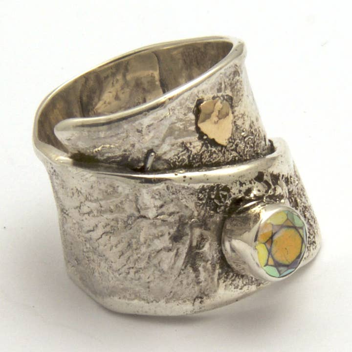 This stunning sterling silver reticulated ring features a wraparound design with an oval teal kyanite stone set in the center. The stone is accented with a 14 karat gold filled bezel clear stone for added sparkle and interest. The ring is easy to wear and measures approximately 20 to 22 mm wide, tapering down to 8 to 7 mm at the back for a comfortable fit. The unique design and beautiful gemstones make this ring a standout piece that is sure to turn heads.