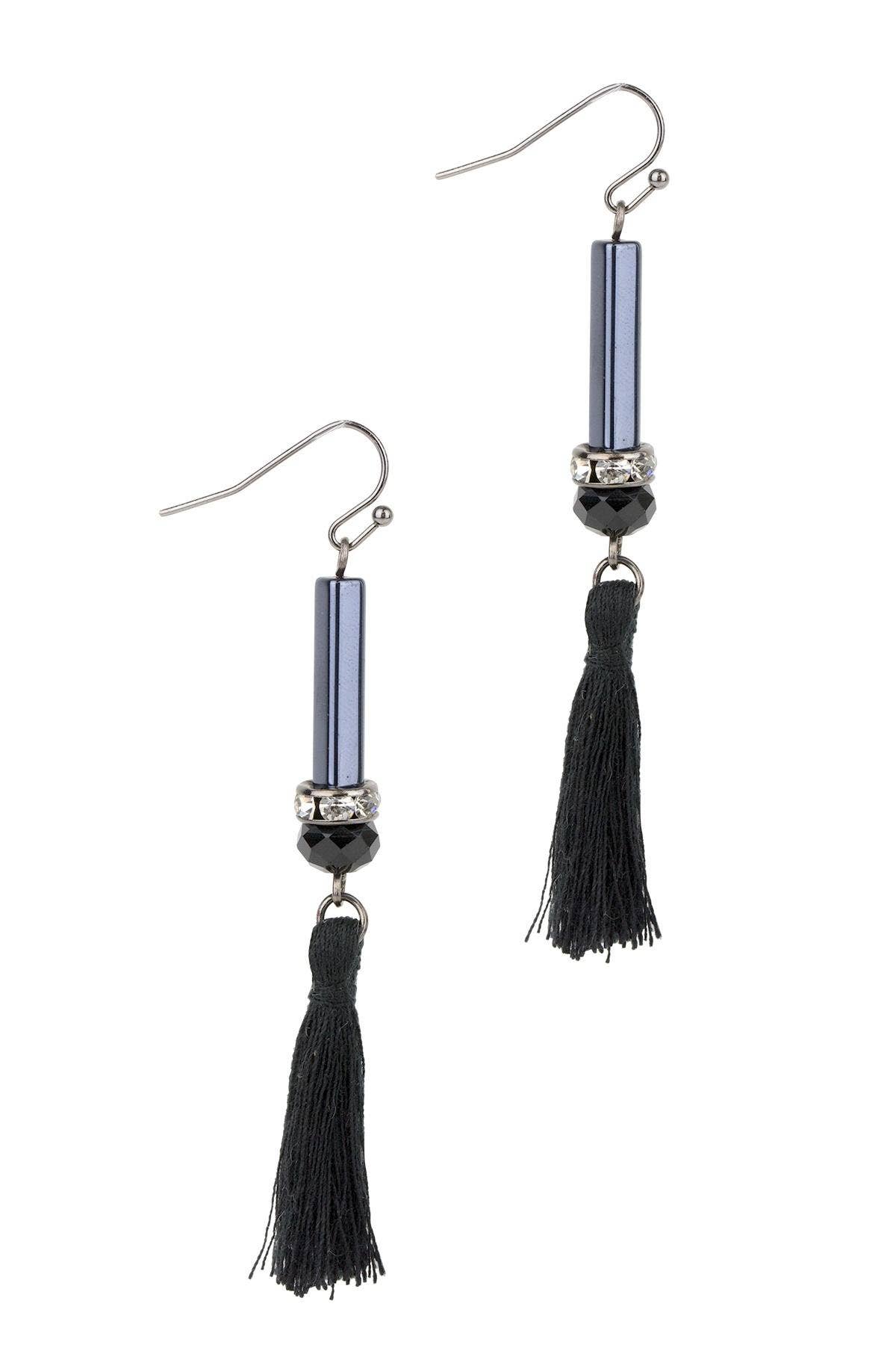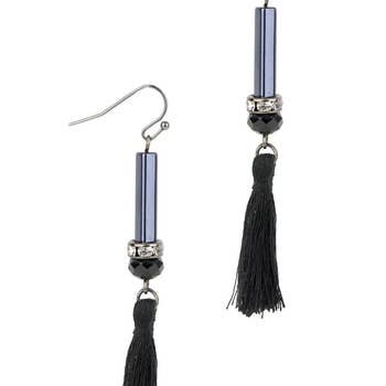 "This modern boho-inspired tassel earring dangles seamlessly from the ear. It is easy to wear, so show off your whimsical, fun side. Our Ras Tassel Earring also pairs nicely with Parijat Tassel Necklace. Materials : AB Beads, Glass Tube Bead, Polyester Tassel Size: 2" Long Hook Backing"