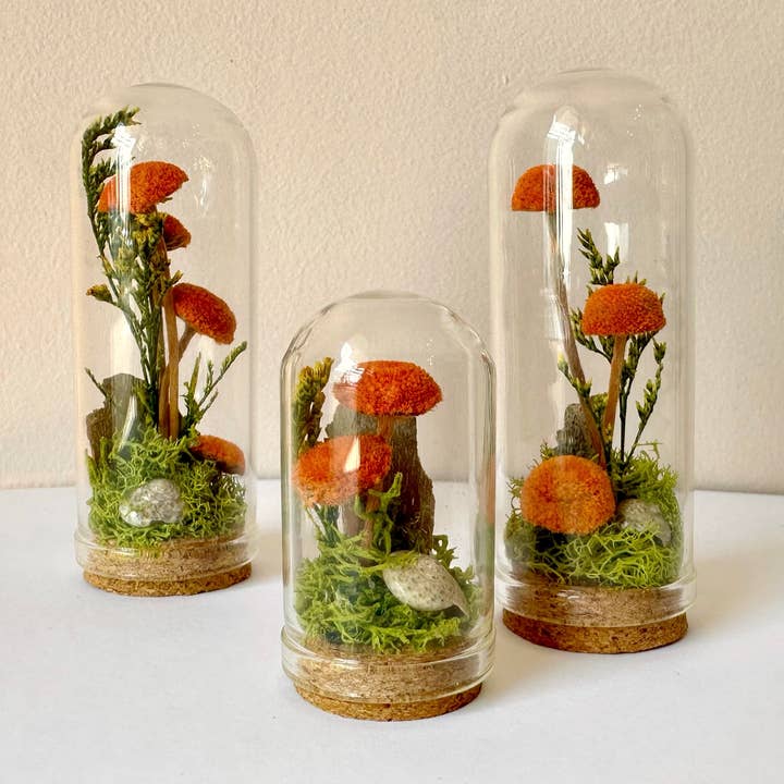 Glass terrariums made with real dried florals and mosses! These are the perfect desk trinket or decoration for your nightstand or windowsill. These make great gifts for gardeners, mushroom lovers & your friend who loves cottagecore! PLEASE NOTE: Due to the nature of handmade each terrarium is one of a kind, but each will share the same theme as the terrariums pictured. Mushroom Fields Terrariums will have red mushroom-like flowers, bright green moss and may have a pebble or snail shell. CARE: Dust as needed. Do not open the terrarium & keep out of direct sunlight to avoid fading. No watering is needed. INCLUDES: Choose from 2 sizes, 1.75" tall and 2.75" tall Mushroom Fields Terrarium. Other props not included. Each terrarium is one of a kind and may vary slightly from the photos. MATERIALS: Glass & cork terrarium, dried plants & mosses.