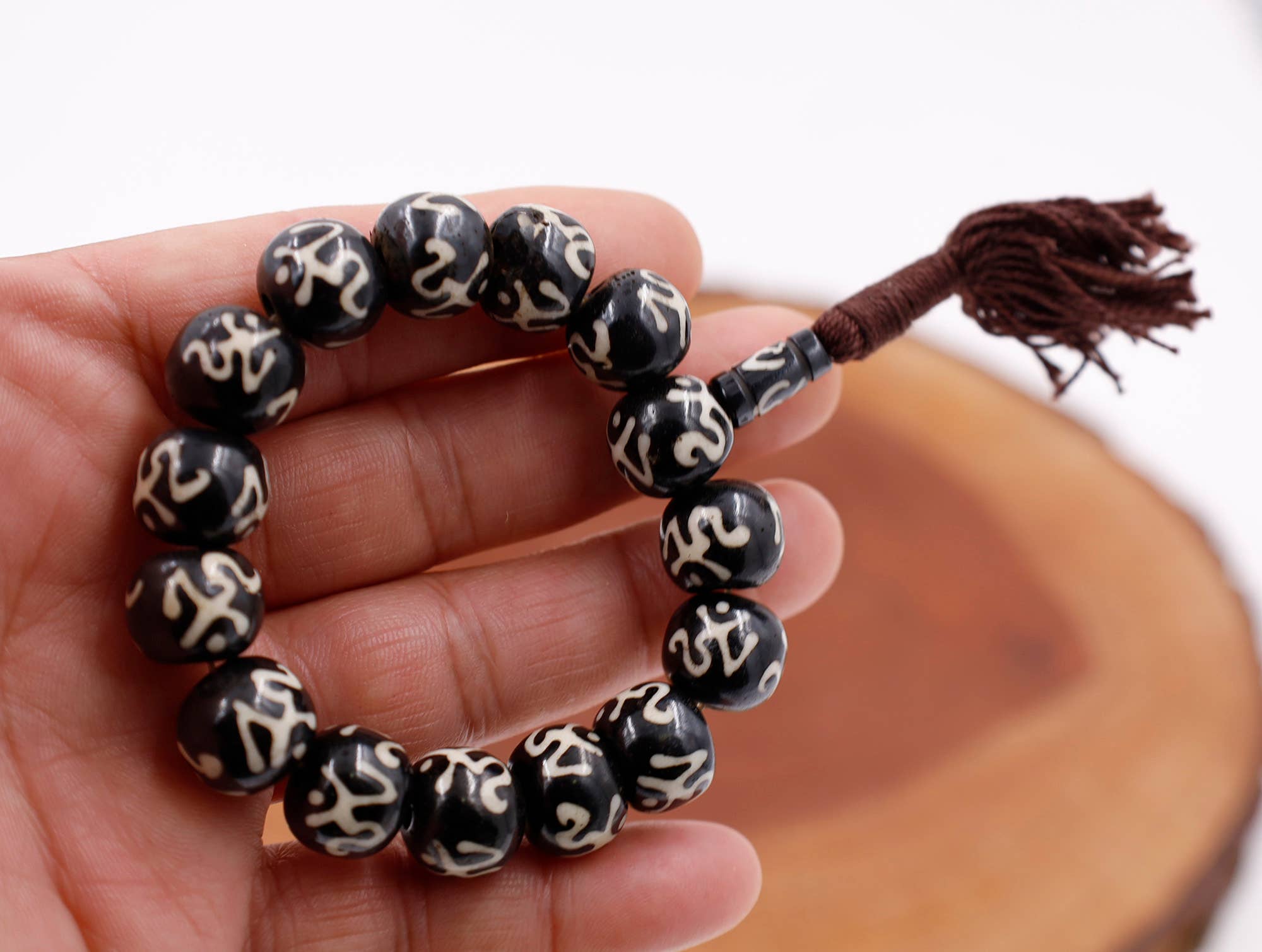A truly intentional mala: 46" Bodhi seed beads with three Om-carved conch shell accents, a red-and-gold adjustable pull cord, and a wooden box for safekeeping—made for meaningful practice. Great quality!!