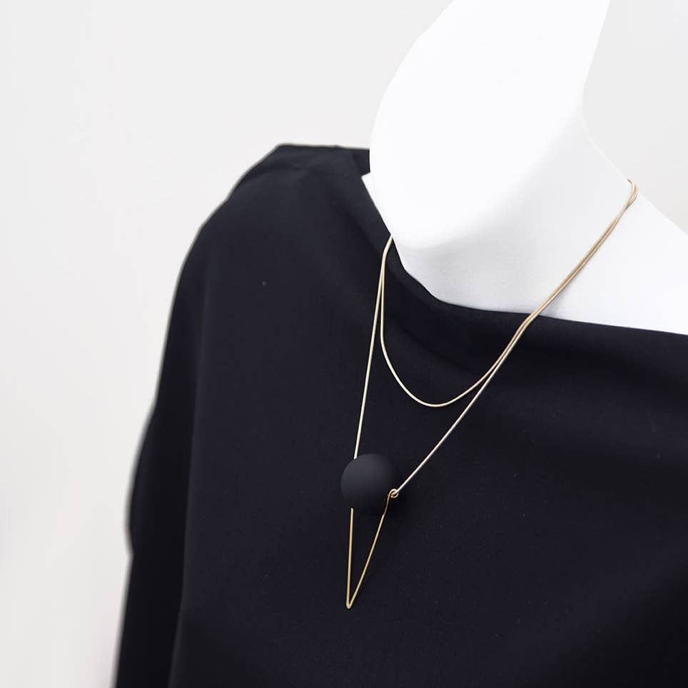 This delicate short necklace hangs slightly askew, and is offered in multiple contrasting colourways. A striking design that sits comfortably against the collarbones and is simple enough for everyday use as well as special occasions. Materials All metals are brass finished with plating (see below) *Orbs are solid acrylic with silk coating (*Nickel Free) Finishing 12K Gold, Rhodium, Rose Gold, *Black Zinc on brass (*Nickel Free) Dimensions 1 mm brass snake chain, plating as noted above Overall, pendant is 3/4" x 4 3/4". Approximately 17 1/2" long + extension,*Slight variations may occur.