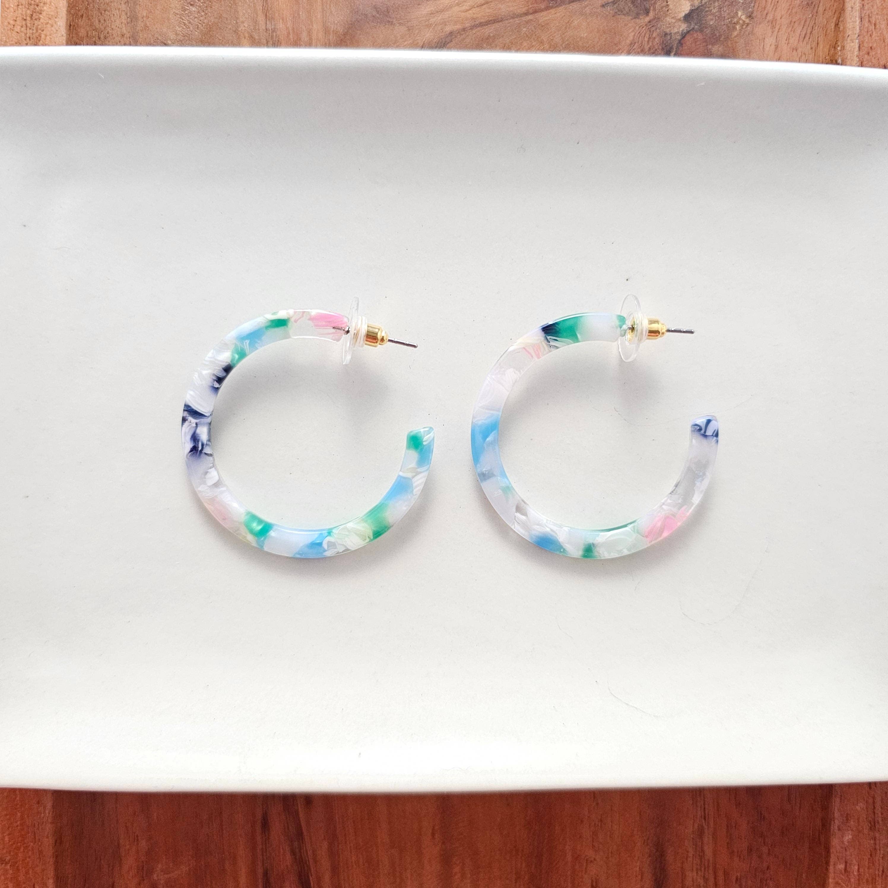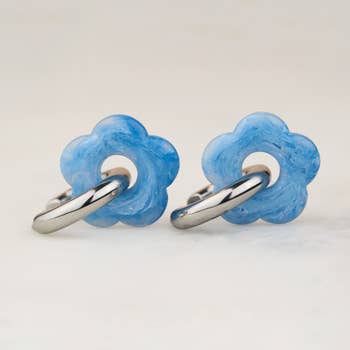 Bring a touch of nature-inspired elegance to your shop with these handcrafted blue flower hoop earrings. Each pair is carefully made from lightweight polymer clay, featuring delicate petal details and a textured center for a realistic floral look. The flowers are paired with sleek gold hoops, creating a versatile design that’s perfect for everyday wear or special occasions. - Measuring 0.75" across with a 1.25" drop length - Lightweight and comfortable - Gold-plated stainless steel hoop - Polymer clay flower