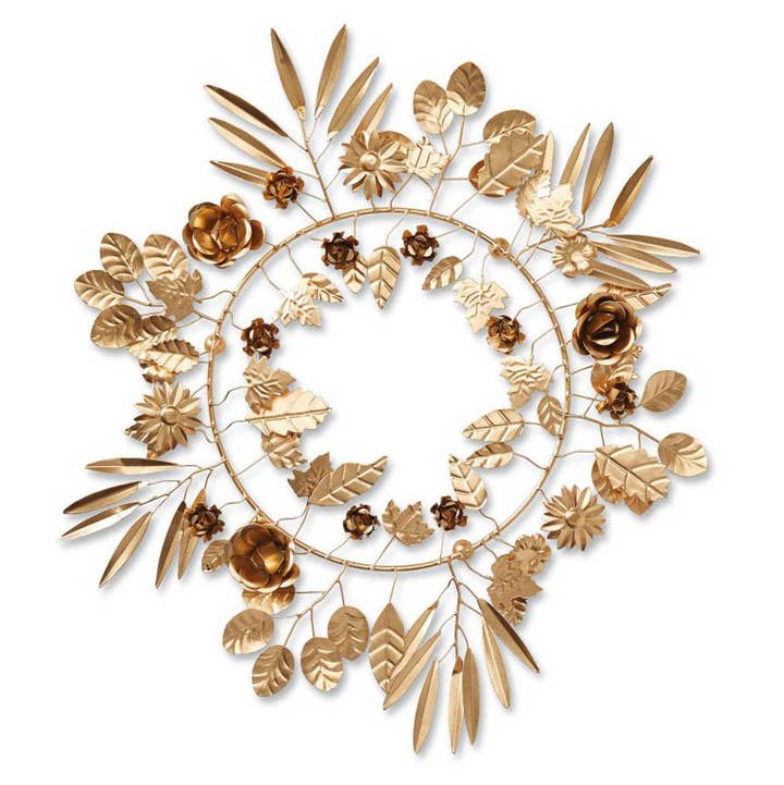 Recycled iron leaves and blooms are finished in matte gold by artisans in India to create this shining fall home decor piece. Looks great on shelves, mantels, or tables. Adjustable. Dimensions: 60"l. Keywords: garland, table decor, centerpiece, autumn decor, fall decor, holiday decor