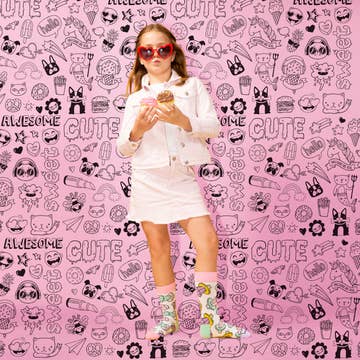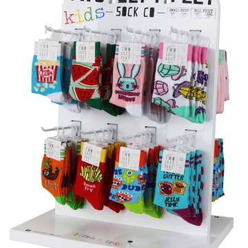 Why should adults have all the fun? Stock up on our kid-approved line of fresh and colorful custom sock designs - just for kids! Twelve fun and playful styles in two sizes. Order 2 units (96pcs) and receive a free rotating counter display. •Small = ages 3-6, sizes 8-13; Big = ages 7-10, sizes 1-5 •48-pc Assortment Includes 12 Custom Styles •Reorder by style/size in 4 packs •Free Rotating Counter Display 96-pc order