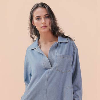 The Denim Longline Shirt Midi Dress is a versatile and trendy piece that combines the classic appeal of denim with the comfort and style of a midi dress. With its long sleeves, this dress is suitable for various weather conditions and occasions. The longline silhouette adds a touch of sophistication, while the inclusion of pockets enhances its practicality and modern flair. The denim fabric provides a casual and laid-back vibe, making it perfect for both casual outings and more relaxed settings. This dress effortlessly marries fashion and functionality, offering a chic and easy-to-wear option for your wardrobe. -Model is 5'9" and wearing a Small