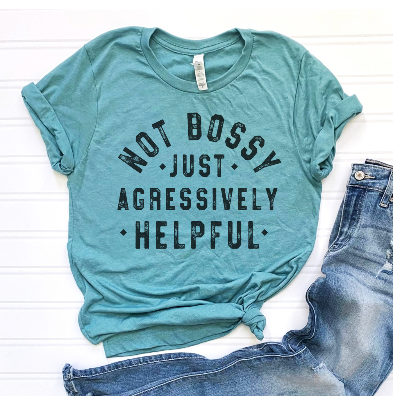 Show your confident and caring side with this "Not Bossy Just Aggressively Helpful" graphic t-shirt. Perfect for women who lead with kindness and determination, this comfortable tee lets you express your proactive spirit with a touch of humor. Ideal for everyday wear, it’s a stylish way to celebrate your helpful nature while staying relaxed and confident. GRAPHIC PROCESS: Our tees are printed using the sublimation process in which the ink is actually dyed into the shirt fibers, meaning that the graphic will not flake or peel away. Ink colors are MOST vibrant on light colored tees. The darker the shirt the more of a vintage look you will see. SIZING: This is a true to size unisex shirt. Our customers are most satisfied with the size they normally wear in a women's size t-shirt. Small fits sizes 4-6 Medium fits sizes 8-10 Large fits sizes 12-14 XLarge fits sizes 16-18 2XLarge fits sizes 20-22 3XLarge fits sizes 24-28 DETAILS: -Crew Neck Style -Short Sleeve -Modern, unisex fit- -Solid Colors: 4.2 oz./yd², 50/25/25 polyester/combed ring spun cotton/rayon, 32 singles -Preshrunk -Side seamed -Retail Fit -High quality soft fabric -Unisex is a looser fit, very similar to men’s sizing. CARE: -Wash inside out with like colors. -Tumble dry low or hang to dry. -Do not iron directly over design. -No bleach/fabric softener. MATERIALS: -High quality heat transfer -Professionally heat pressed