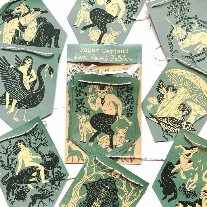 When the days are warm and the nights are short, we near the summer solstice, a time when demons, fae and witches roam freely. They join us as we celebrate the longest day of the year, with ancient tradtions of feasting, fire and dancing. This garland features eight illustrations of folklore from the summer season, from the wild witches of Walpurgisnacht who celebrate the birth of the devil, to the rise of the Oak King. It is approximately 6 feet long and intended for indoor use only. Comes in packaging, printed on both sides with brief descriptions of the illustrated folktale reverse side. String colour may vary. This item is designed, made and packaged on Mayne Island, in British Columbia Canada