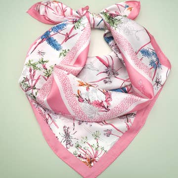 SKU: BLU-BLU-BOT Made in China Care Instructions: Hand wash Color: Pink Fabric: 100% Silk Occasion Theme: Everyday Pattern: Floral Scarf Style: Square Season: Spring/Summer Product Language: English Weight: 42.52 g (1.5 oz) Dimensions: 55.9 x 55.9 cm (22 x 22 in)