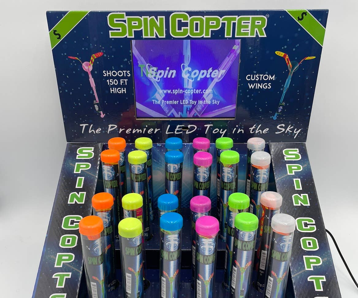 LED Slingshot helicopter w/LCD screen display is our best seller! It's a great impulse buy in all retail categories. Our high quality 1080p screen has an 8' power cord & is the perfect attention getting display. The floor display is 16"W x 10.25"D x 60"H and is highly visible to draw customers & increase sales! The included video shows the many ways & places to shoot up Spin Copters. Spin Copters have high quality custom wings with a super bright LED light that can be seen up to a mile away & can reach heights of up to 150 feet! It looks like fireworks going up and a spinning UFO coming down. The looping video can be set to auto on/off for store opening and closing. Case count with the tall floor display is 144 individually packaged Spin Copters in clear plastic tubes. The displays holds 96 at a time and gives you 2 small boxes of 24 to backfill as they fly out your doors! Keep your display and order refills for discounted pricing for exsisting customers.