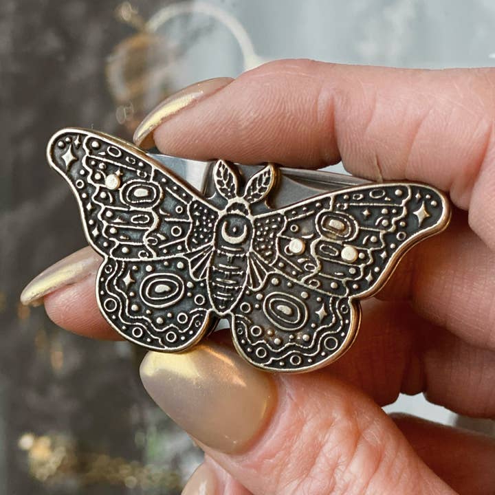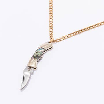 Finely crafted tiny blade necklace, fully functional with mother of pearl inlay. MATERIALS & DETAILS • Select between yellow, pink, white, or blue/gray Mother of Pearl inlay* • Brass plated steel knife • 30'' of the finest quality UK manufactured chain in your choice of 2mm brass rolo or 1.5 mm satellite • Select between yellow, pink, white, or blue/gray tone Mother of Pearl inlay • When closed the knife measures 1 3/4" long and has a 1" blade. *Stone colors and patterns will vary slightly, but will be just as beautiful and similar to the colors shown.