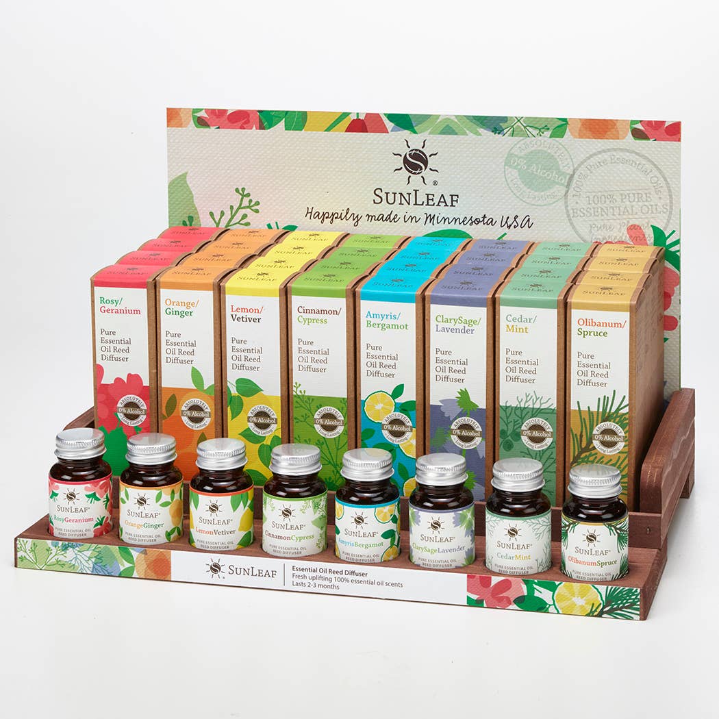 This 40 piece Essential Oil Aromatherapy Blends Collection includes 8 scents (5 of each) of the following signature scent choices: · Amyris Bergamot · Cardamom Copaiba · Cedar Mint · Cinnamon Cypress · Clarysage Lavender · Lemon Vetiver · Olibanum Spruce · Orange Ginger · Patchouli Lime · Rosy Geranium plus a wood display and a tester for each scent..... The 100% pure essential oil aromas are made from steam-distilled or cold-pressed essential oils, lot-tested and certified for purity. Formulated to match the signature aromas of our essential oil reed diffusers and candles, these blends are fully-concentrated and ready for use in an ultrasonic diffuser or to make your own DIY recipes. Happily made in Minnesota!