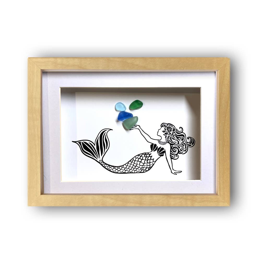 Made to order - These are 5x7 maple effect framed shadow boxes that exhibit handcrafted original art by Lisa of LISART. Each shadow box is meticulously arranged with sea glass of varying sizes, shapes and colors, ensuring that every piece is uniquely crafted & one-of-kind, showcasing Lisa's artistry beautifully.