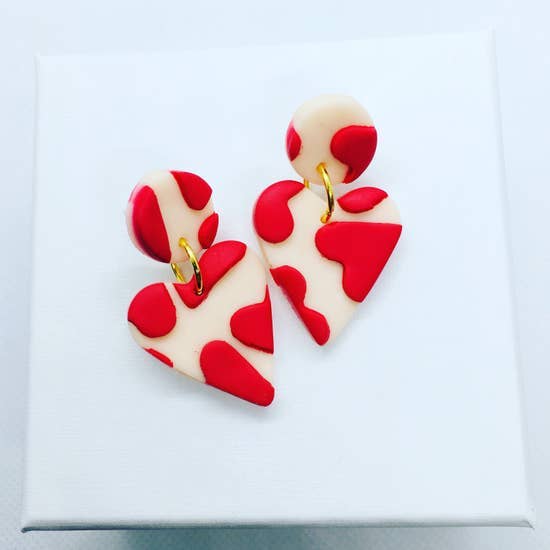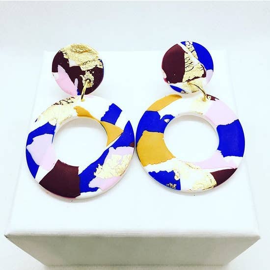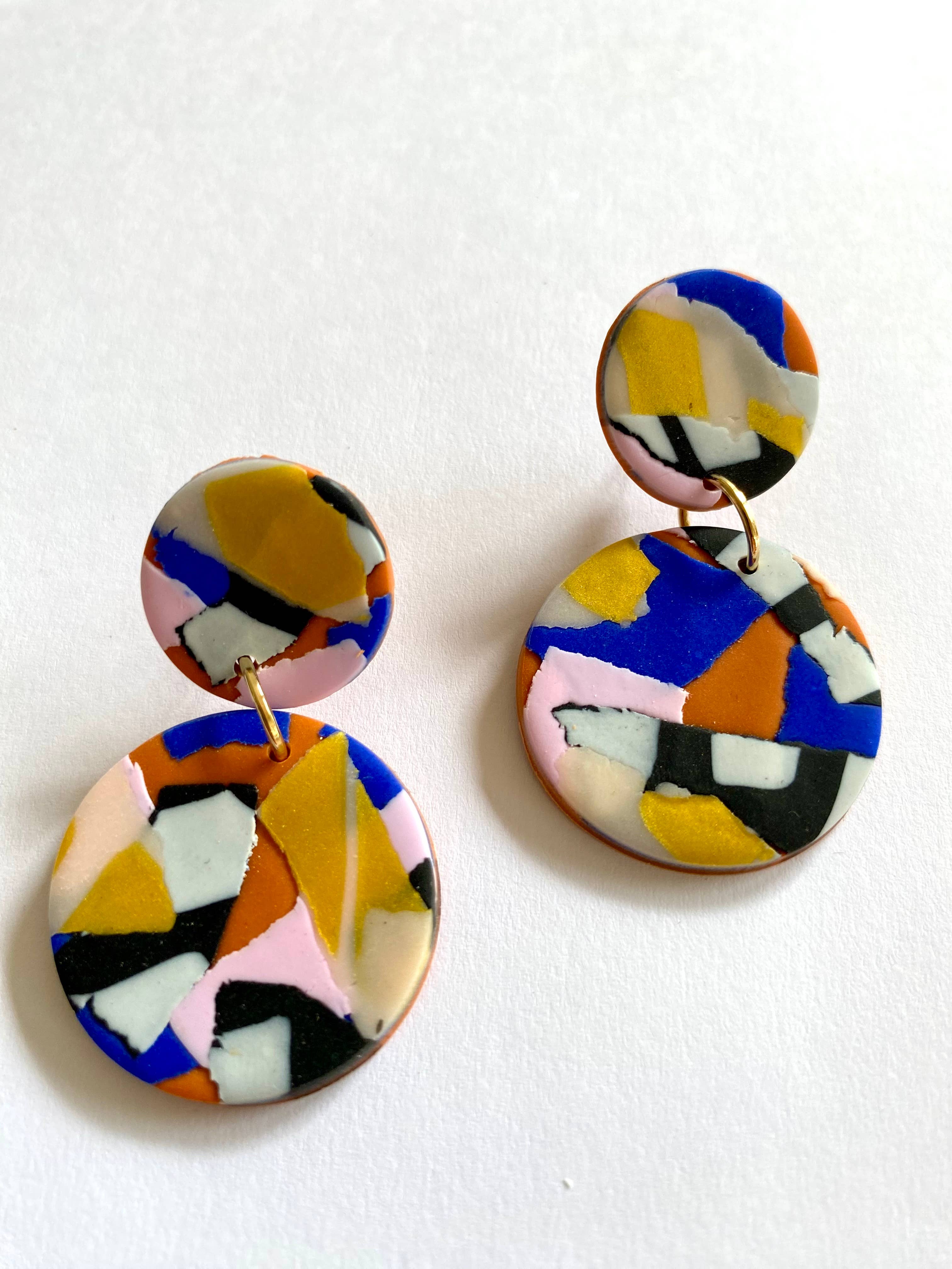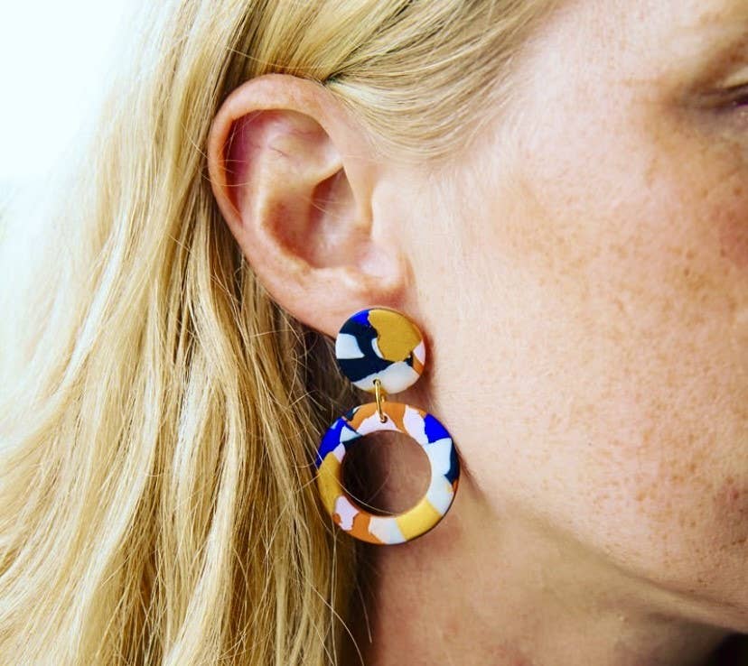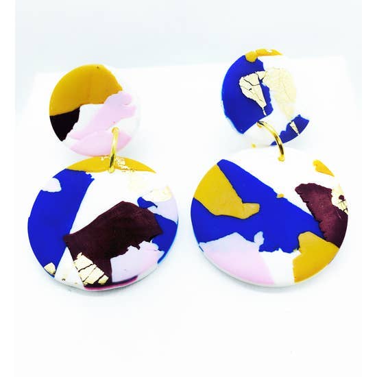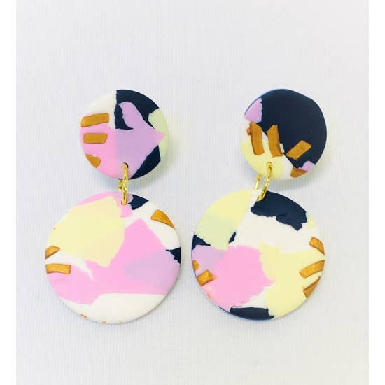 Featured at the Tate Modern Museum. Pretty multicoloured round drop polymer clay earrings. Reminiscent of the Australian landscape. Silver plated nickel-free findings. L: 4.5 cm. W: 3 cm. Drop: 5 cm.
