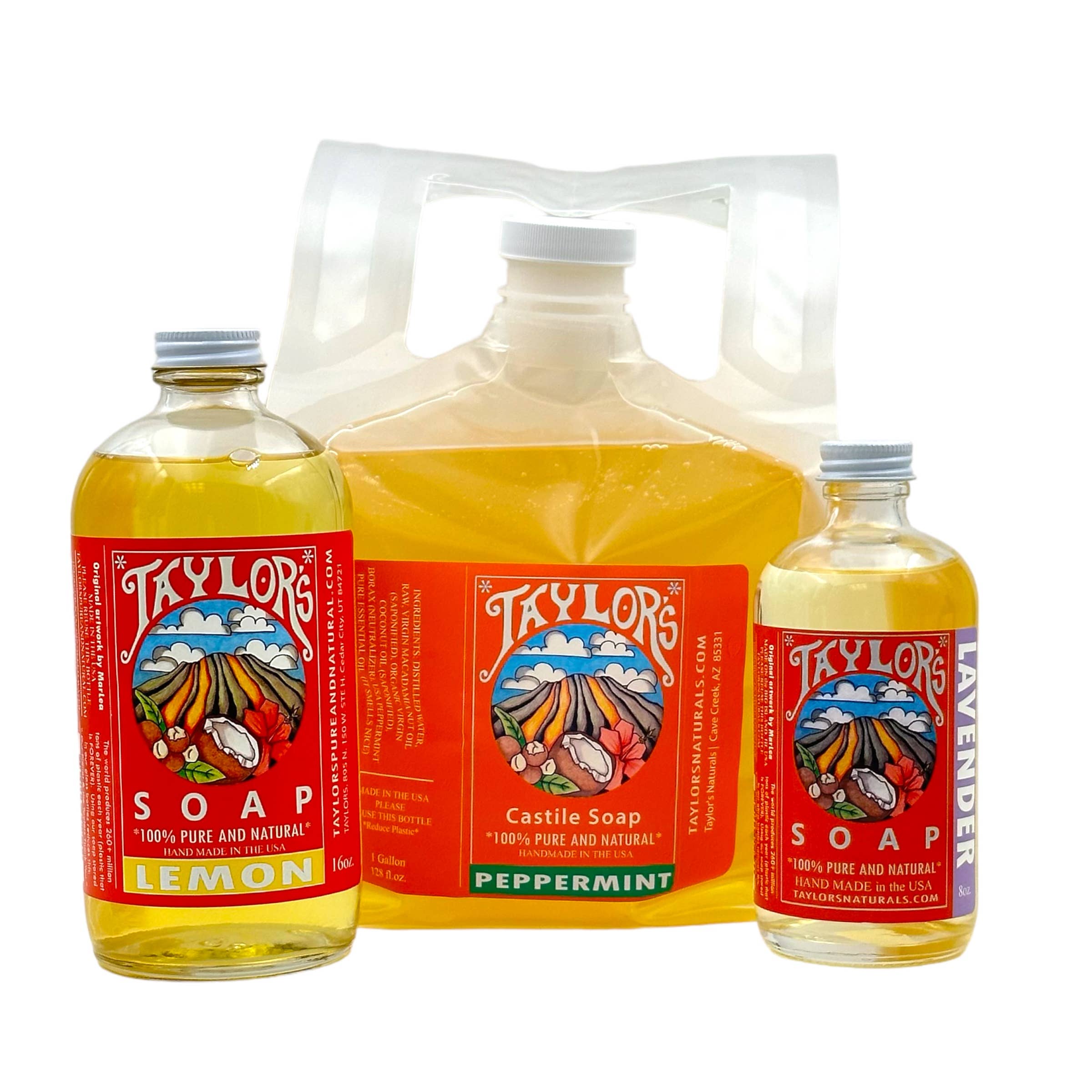 This is our Original 100% Pure Liquid Castile Soap. Using healthy oils found in Hawaii, we call it our Big Island Blend. Blended with Raw Macadamia Nut and Organic Coconut Oils, this lush, tropical liquid soap will not only clean your entire body, but has many more uses! Bodies are not the only thing this soap cleans! Castile Soap is ALL purpose! Use it on virtually anything: Dishes, Laundry, Floors, Hands/Body and more! * 1 Gallon Reusable Collapsible Bottle for Refill Shops * 100% Pure & Natural Ingredients * Organic and Natural, Handcrafted in the USA * Vegan / GMO FREE / Cruelty FREE (Leaping Bunny Certified) We do not use any additional additives. Depending on scent and essential oils used there may be differences in color and thickness. For example: Lavender produces a thick soap and citrus will be thin