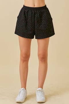 Structured textured woven shorts with dart front detail, elastic waist in the back and side pockets (fully lined) MADE IN USA: 98%POLY,2%SPAN BOHO / BOHEMIAN / WESTERN / FOURTH OF JULY / MEMORIAL DAY / RED / CHERRY / TIER / RUFFLE / RODEO