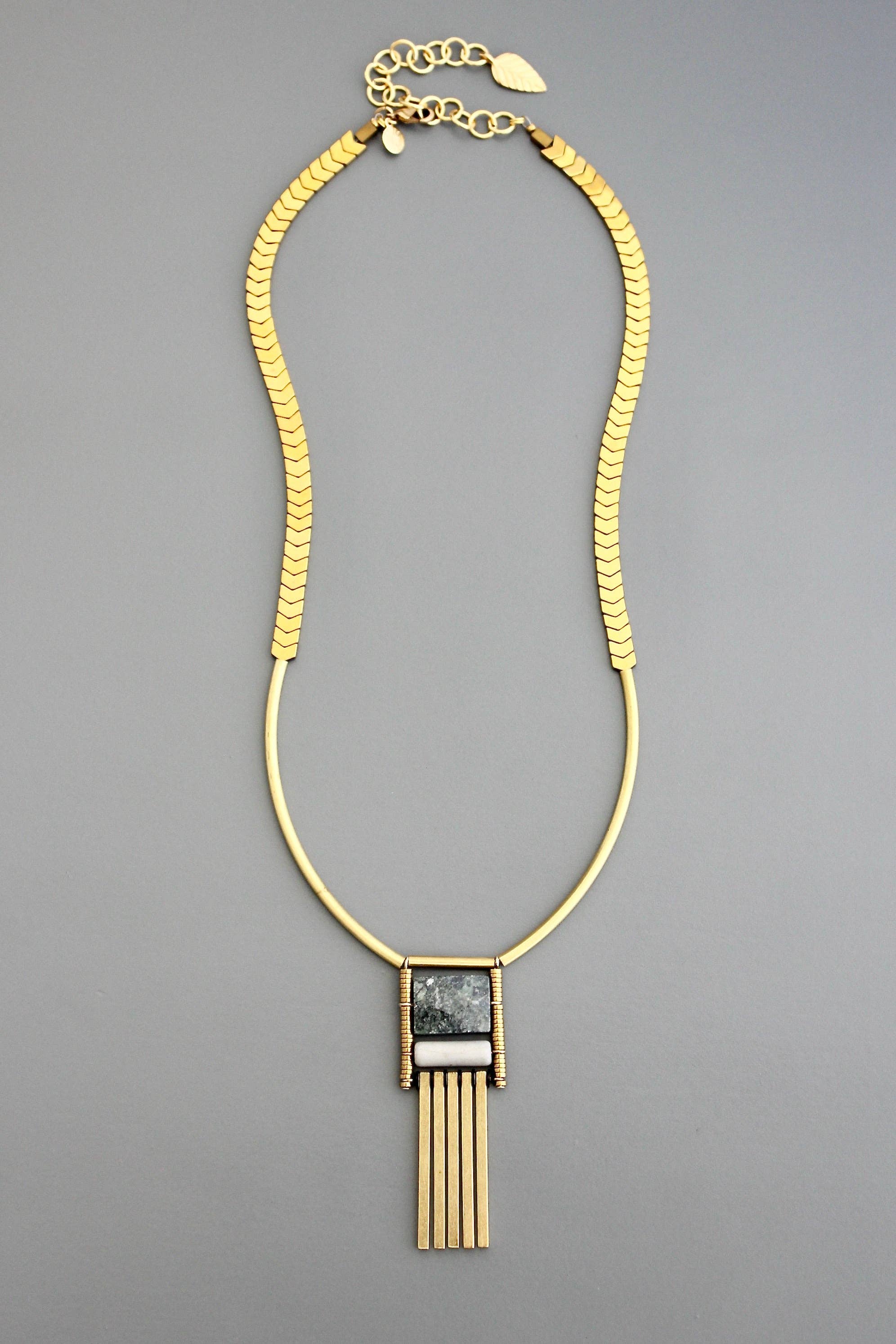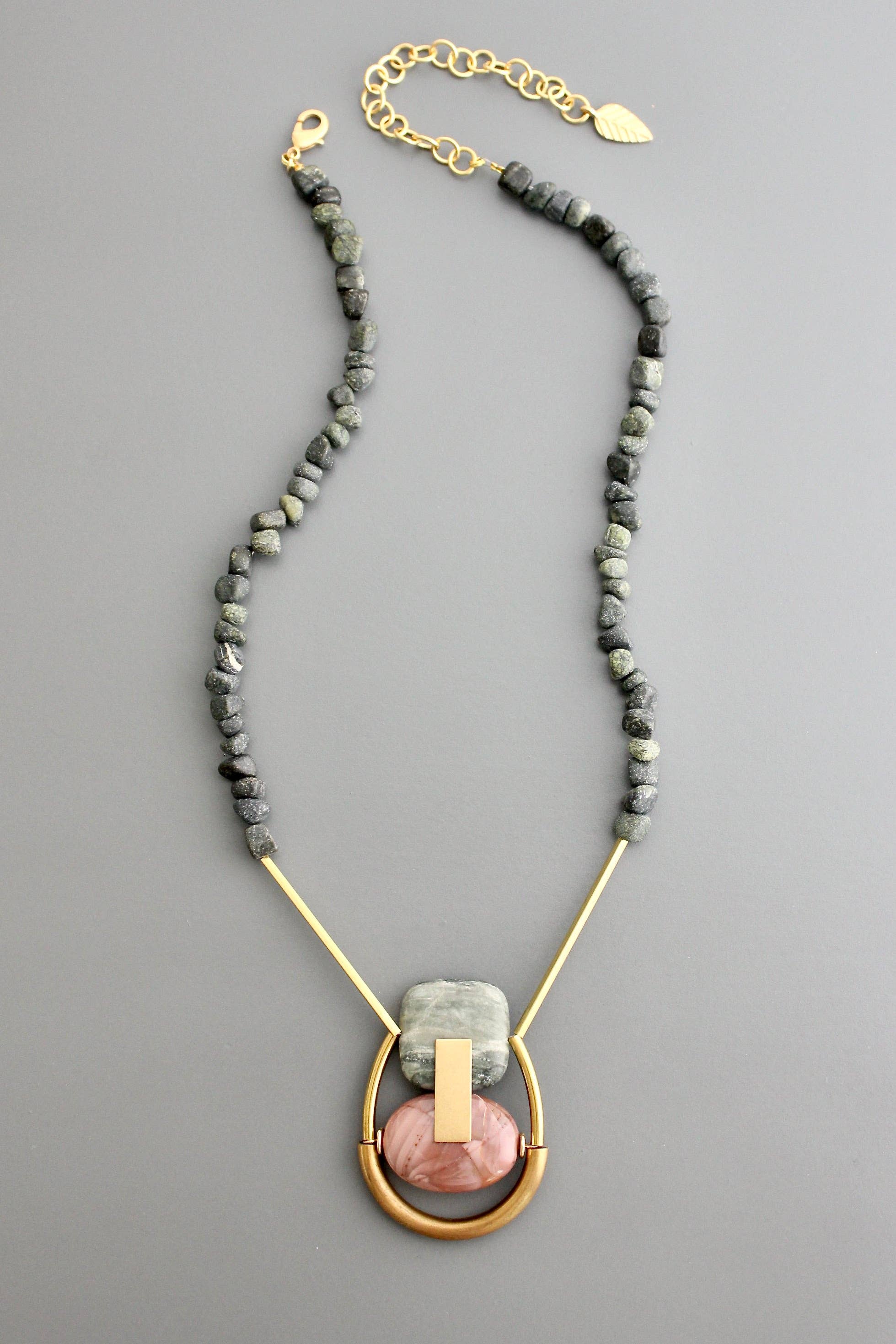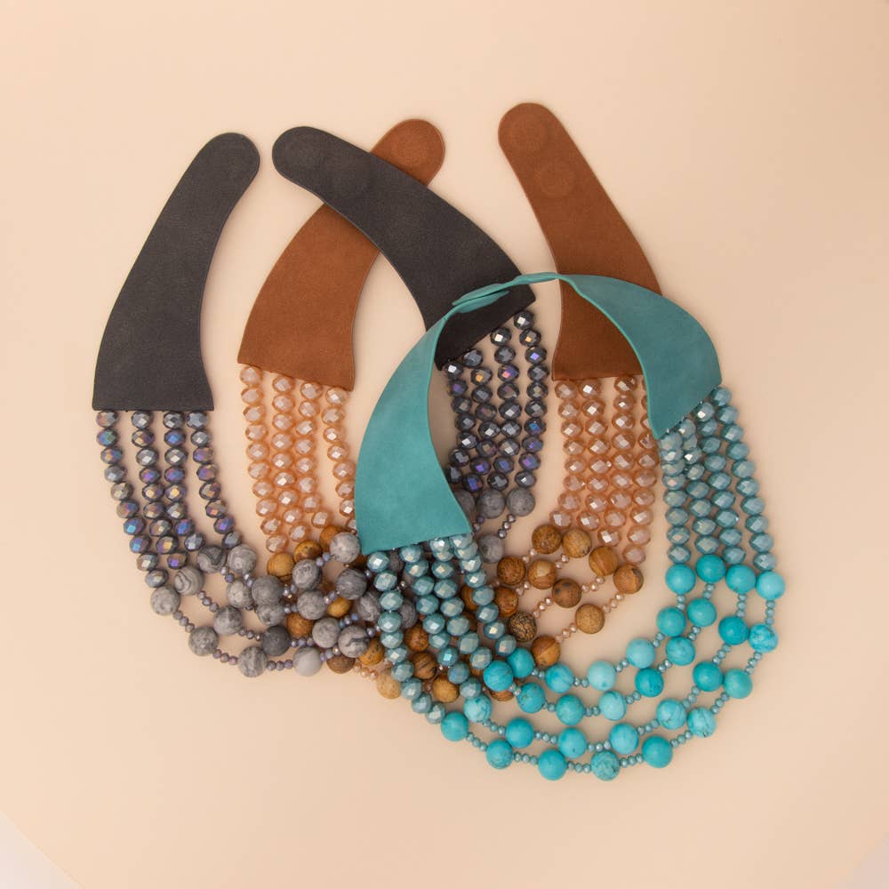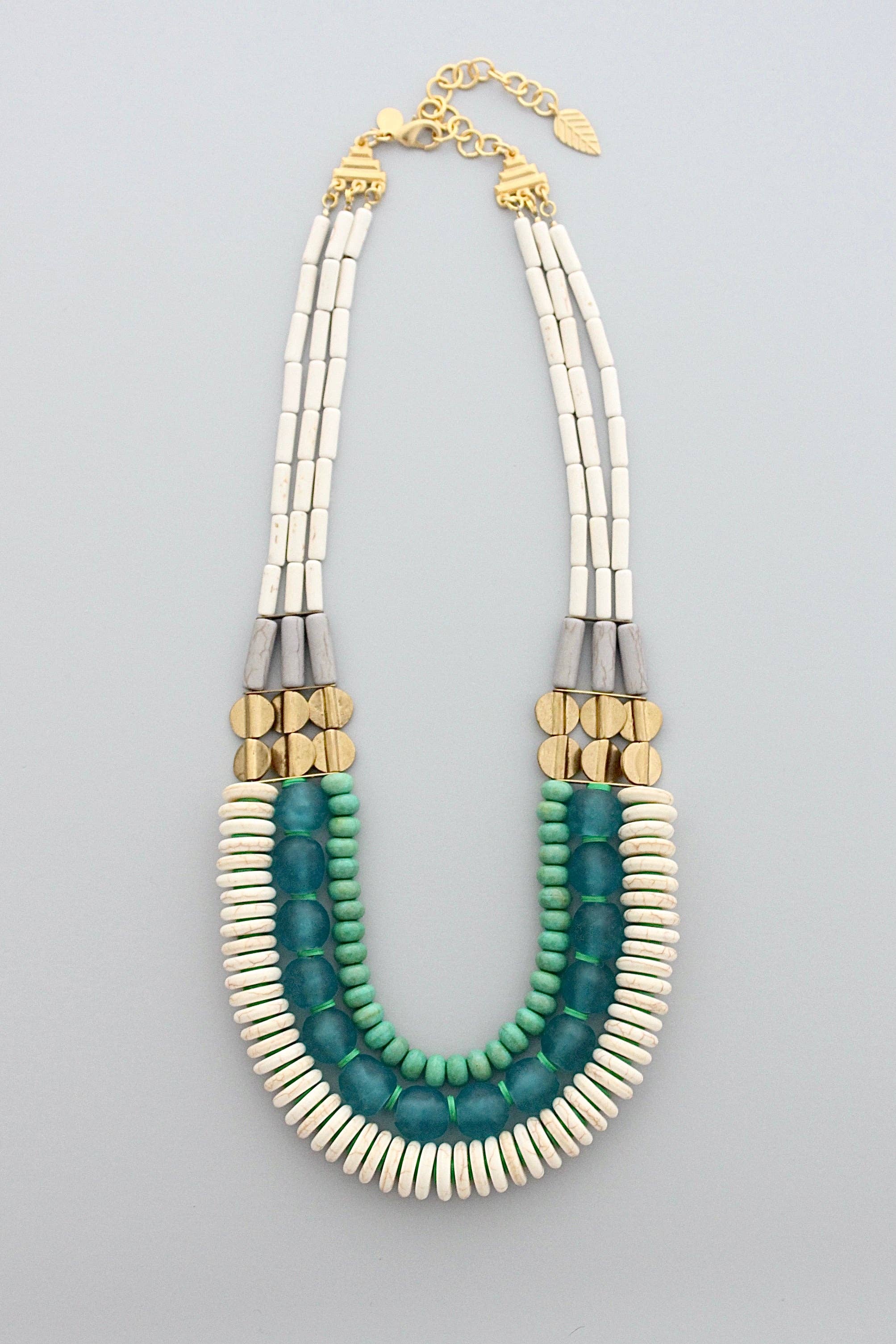 21” triple strand necklace with hematite, glass, brass, and dalmatian jasper. 2 inch extender.