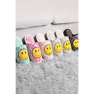 Happy Vibes - Smiley Face Flower Fuzzy Plush Slippers