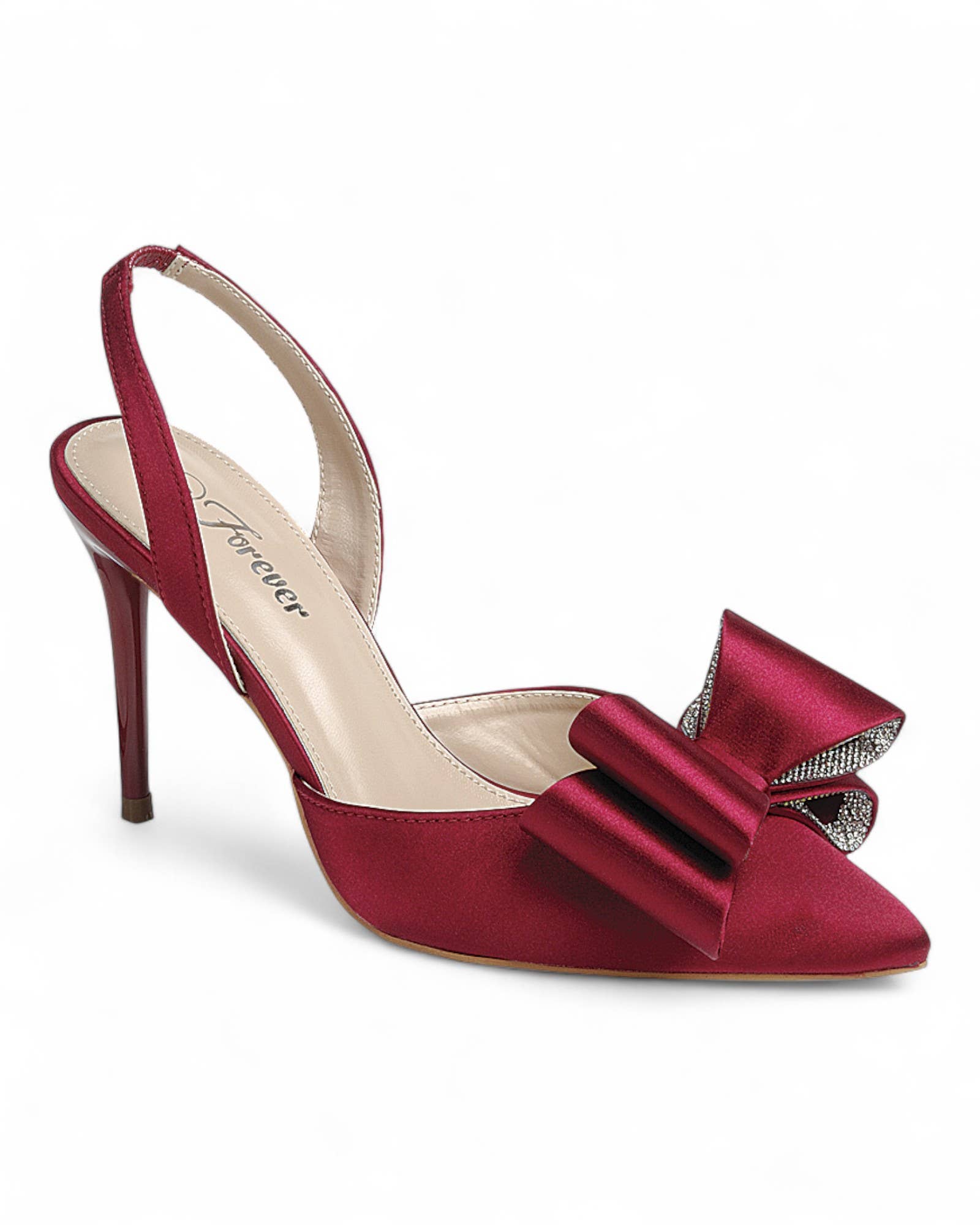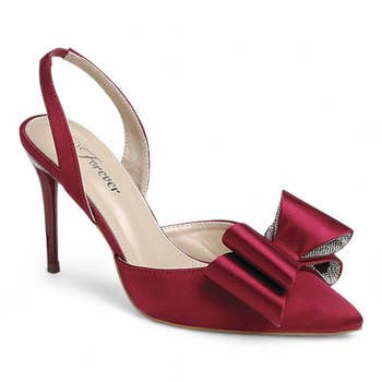 The Georgina pointed toe sling back shoe features a stiletto heel, and is decorated with a bow on the upper. • Upper: 100% Faux Leather • Outsole: 100% Rubber • Lining: 100% Faux Leather • Heel Height: 3.74"