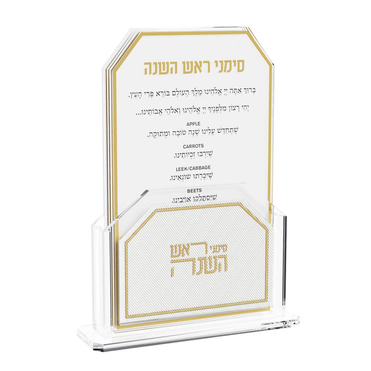 A stunning Laser Cut Honeycomb Simanim Card featuring a luxurious gold 3D raised title and honeycomb effect, is a tasteful and sophisticated addition to your Yom Tov table decor. * 7.9" x 6.7" * Standing legs included