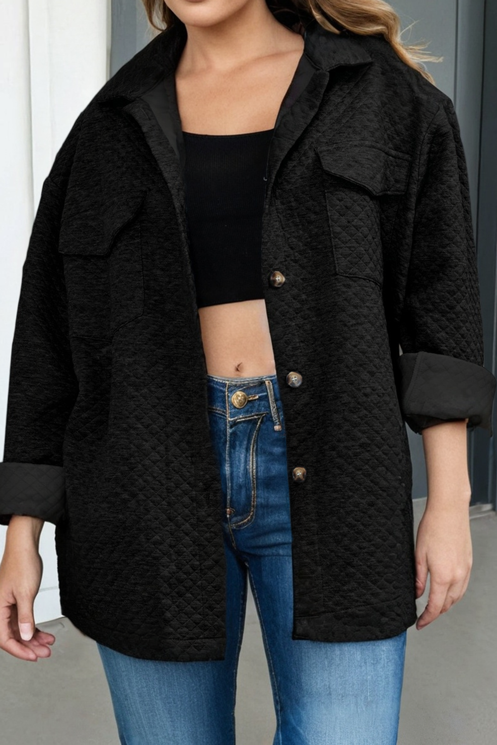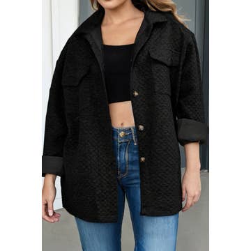 This quilted shacket is the perfect mix of fashion and comfort! Featuring soft, quilted fabric and a button-down design, you'll be sure to turn heads. Plus, the pocket detail adds just the right touch of style. Crafted with ultimate comfort in mind. Ready to elevate your look? Note - The shacket is NOT fleece lined. Sizing: * Small 0-4 * Medium 6-8 * Large 10-12 * XL 12-14 Product details: * Model is 5'7" wearing small.