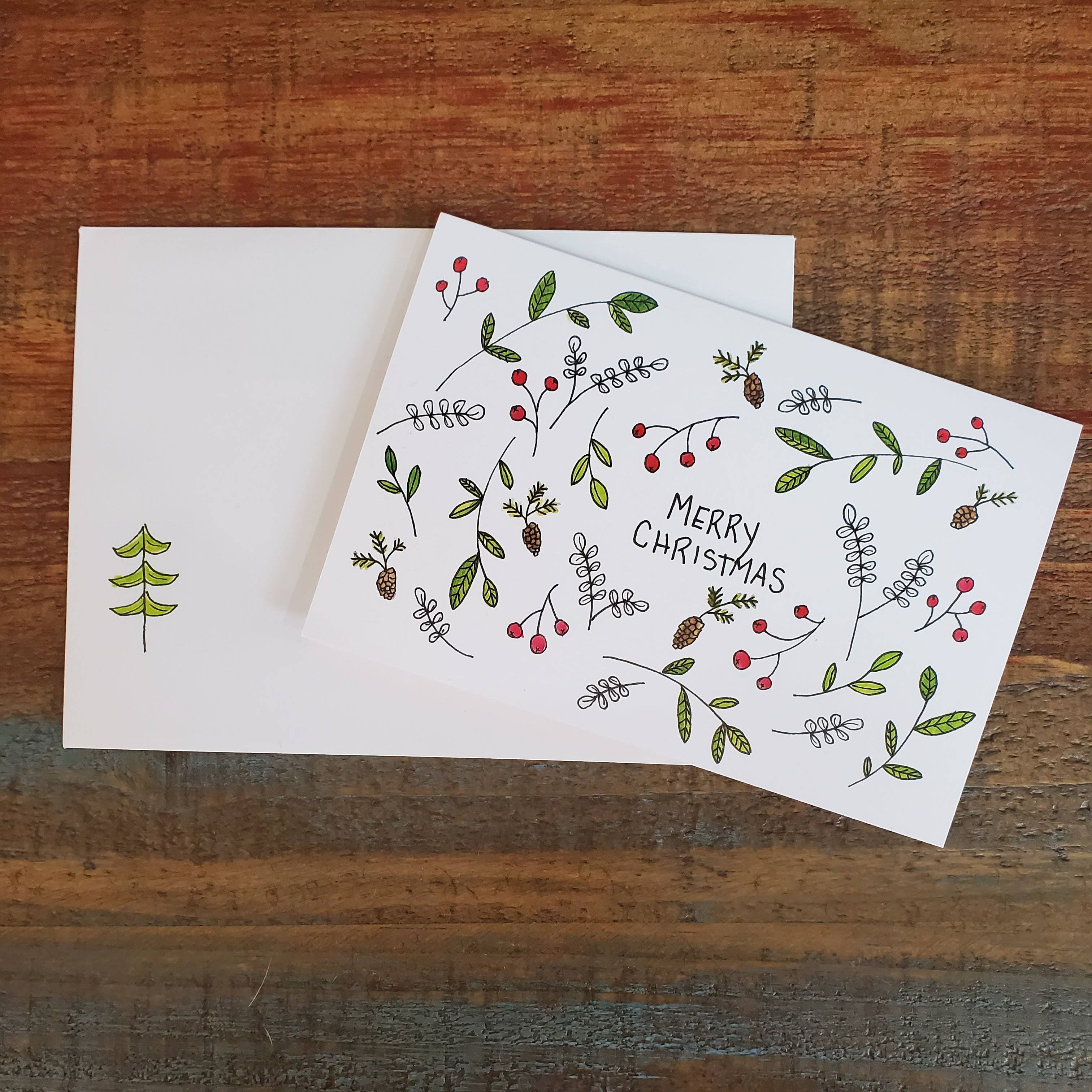 A classic Merry Christmas starry card. Sweet holly and pine tree green. Boxes of 8: packaged in an eco-friendly kraft branded box with open window. no plastic on the window. All cards are A2, 4.25 x 5.5 & blank inside. Printed in the U.S. on 100% recycled FSC paper. Envelopes are kraft, 100% recycled. Illustrations by Cindy LaColla. @cynlastudio